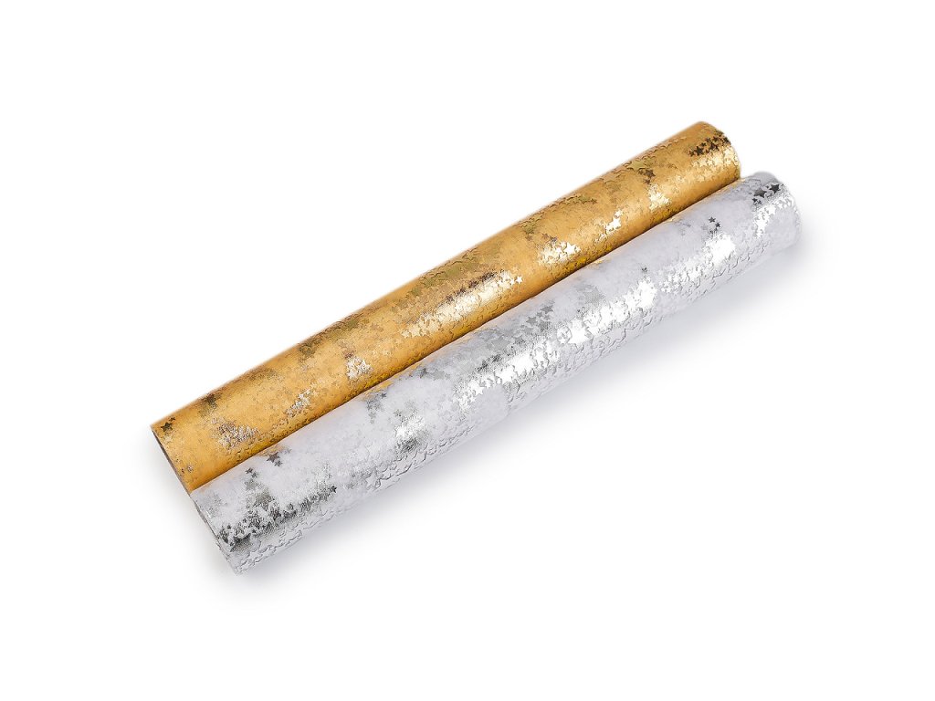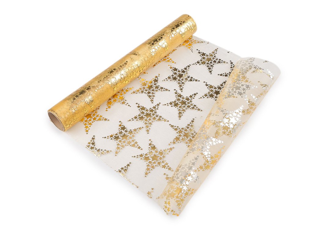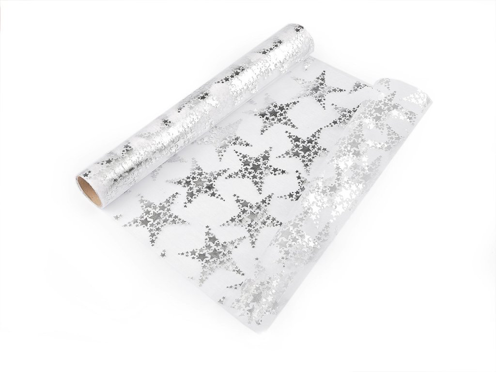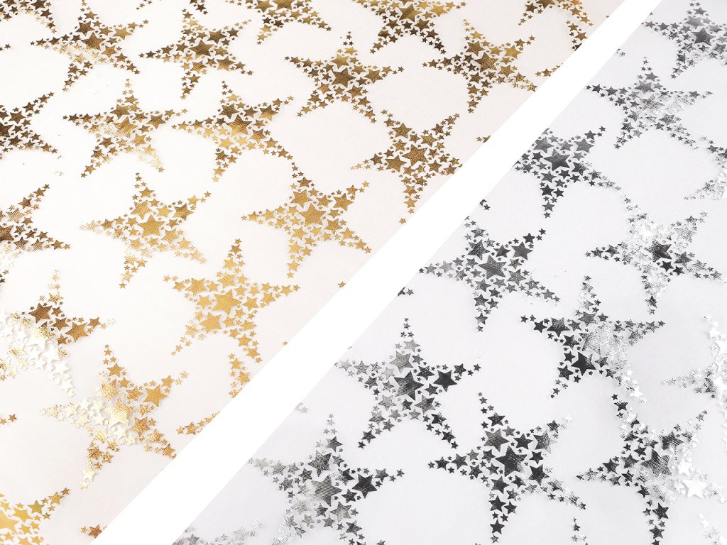 Dekorační organza působí jemně a zároveň elegantně. Zdobí ji metalický potisk hvězd, který je jednostranný. Hodí se ke slavnostním příležitostem.