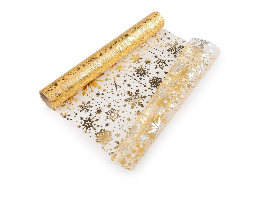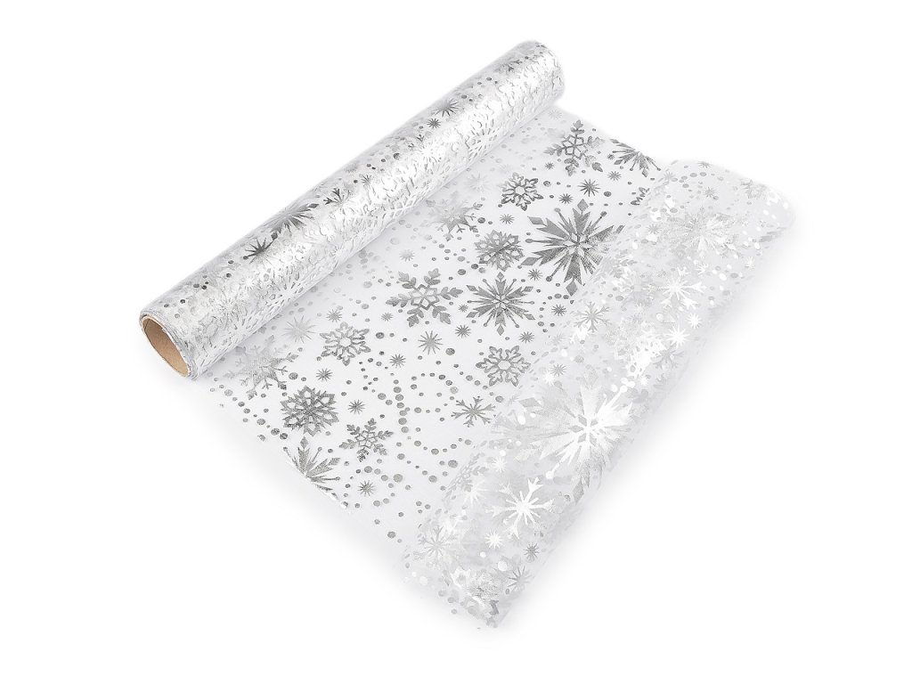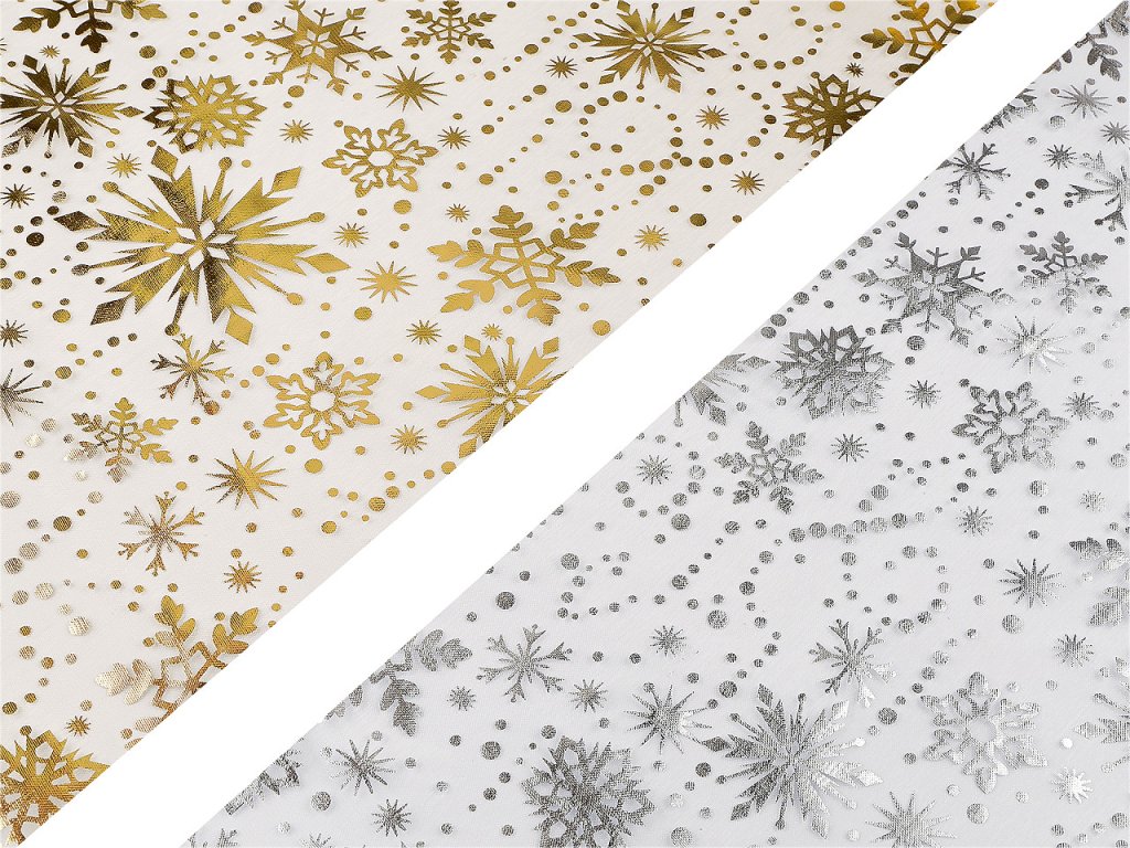 Dekorační organza s potiskem vloček slavnostně dozdobí vánoční tabuli, ale je vhodná i k aranžování a tvorbě různých dekorací. Potisk vloček je metalický a jednostranný.