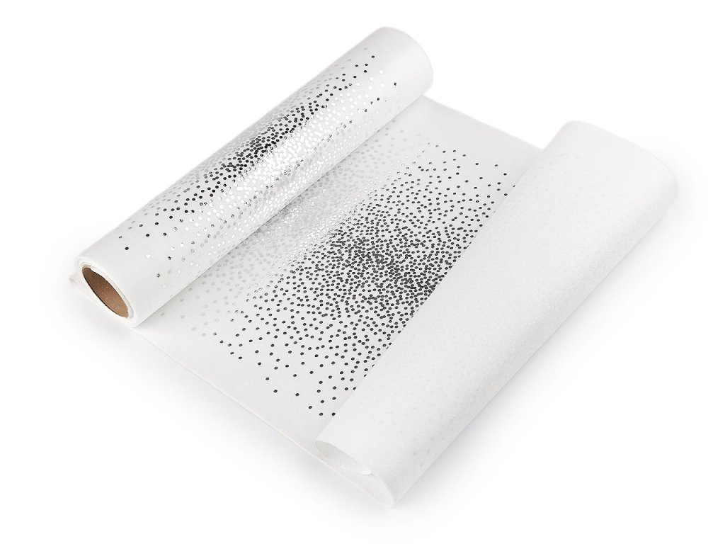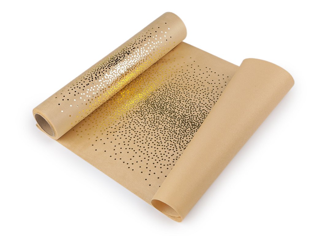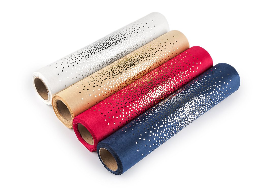 Velvet / samet působí luxusním a elegantním dojmem. Je příjemně měkký na dotek. Vynikne na slavnostní tabuli jako běhoun nebo prostírání. Zdobí ho metalický potisk drobných puntíků.