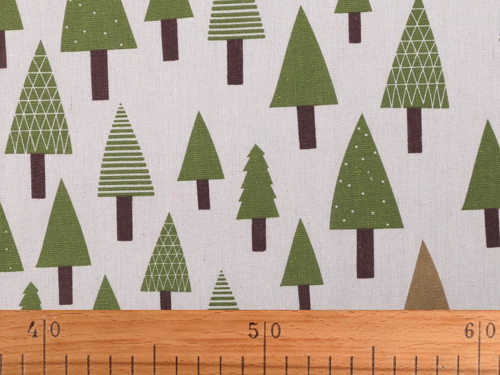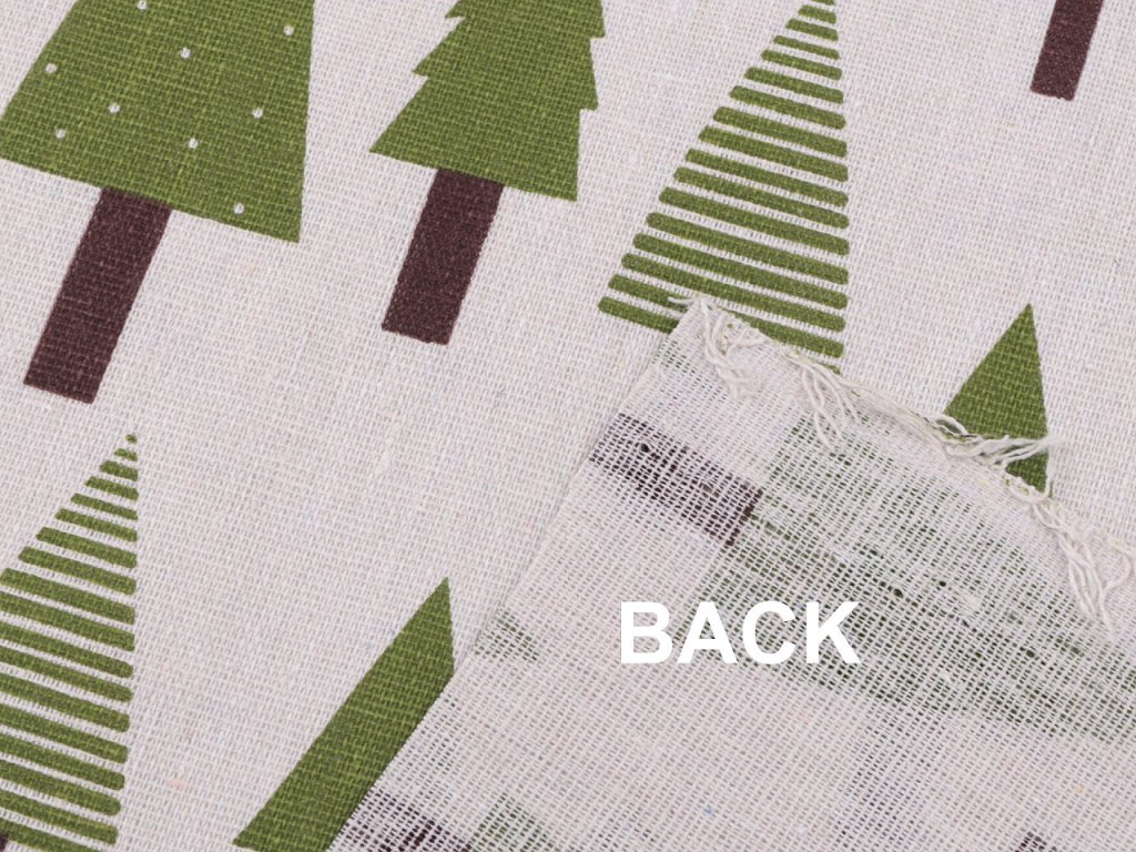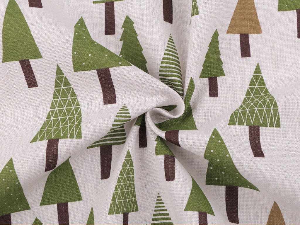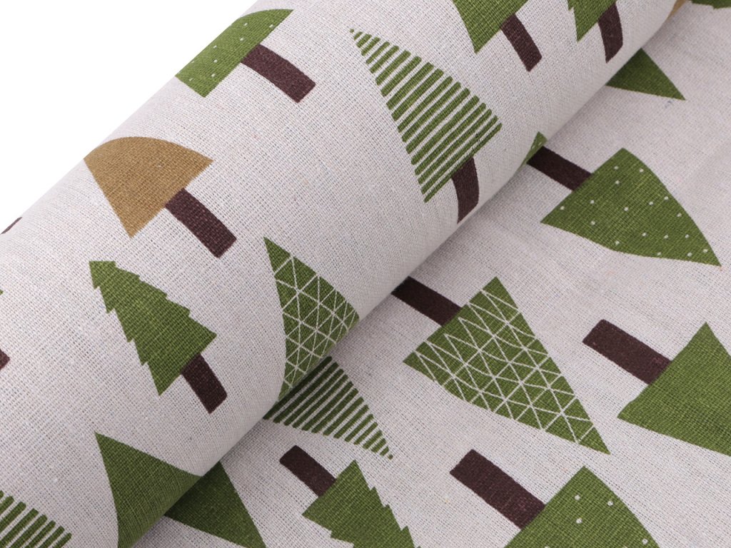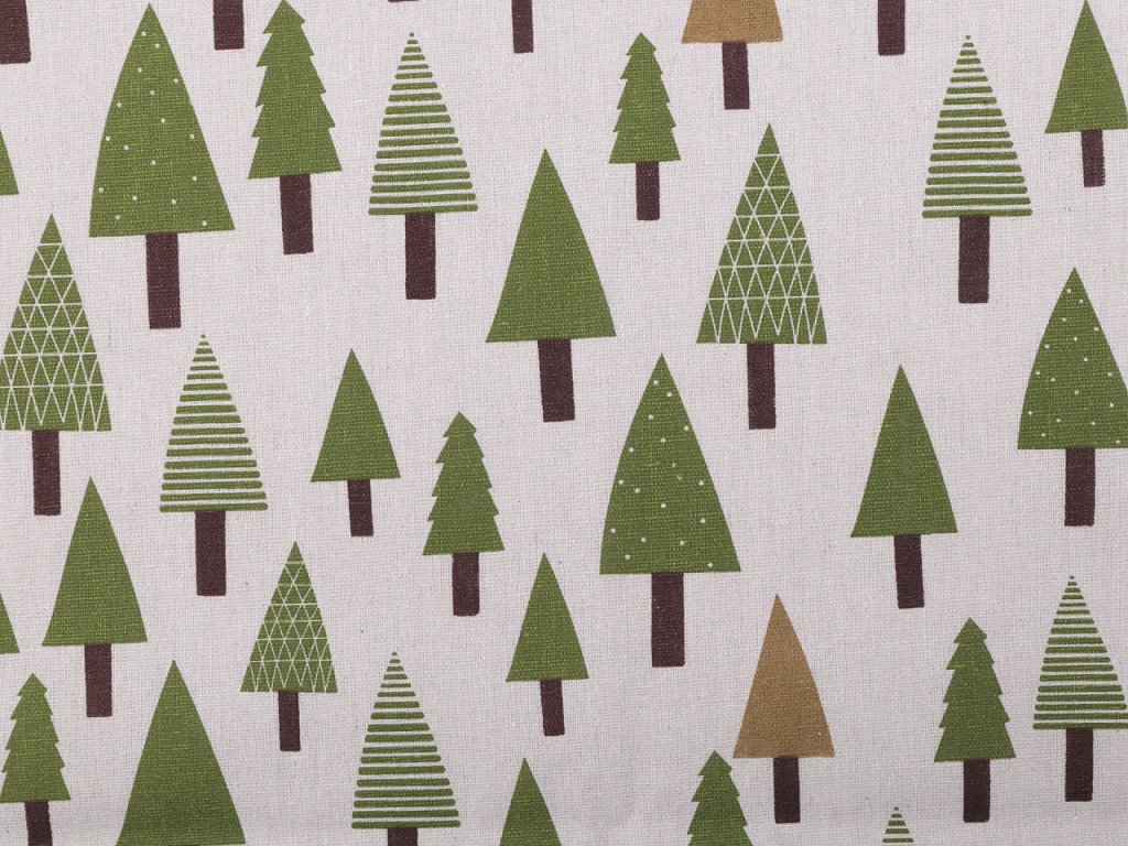 Hrubší bavlněná látka s motivem stromečků svou plátnovou vazbou imituje látky ze lnu. Využijete ji na šití ubrusů, běhounů, prostírání nebo dekoračních polštářů. Látka je vhodná také k šití mikulášských pytlíčků. Je oblíbená i na dětské teepee.