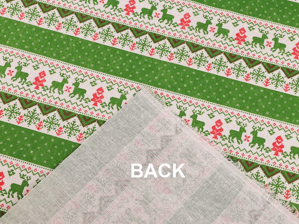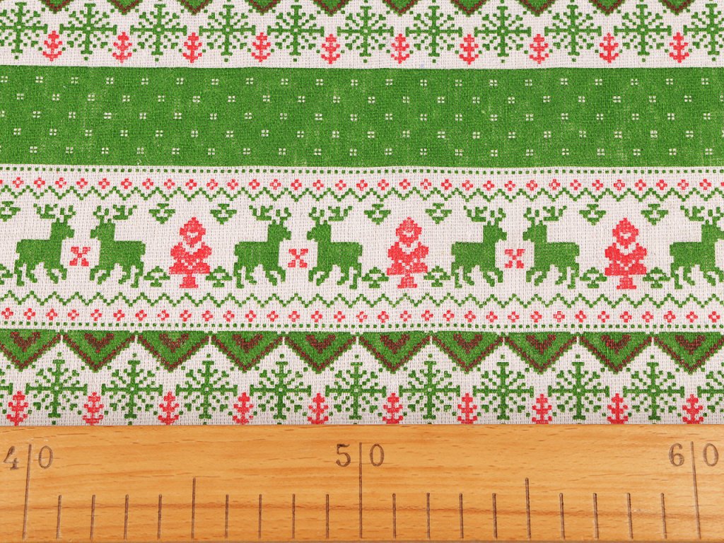 Pevnou dekorační látku zdobí vánoční motivy. Můžete z ní ušít tašky, pytlíky, běhouny na stůl, prostírání nebo dekorační polštáře.