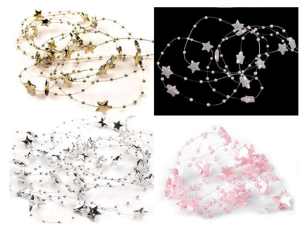 Dekorační perličky s hvězdičkami na silonu využijete jako ozdobný řetěz na věnce, kytice, slavnostní tabule, atd.