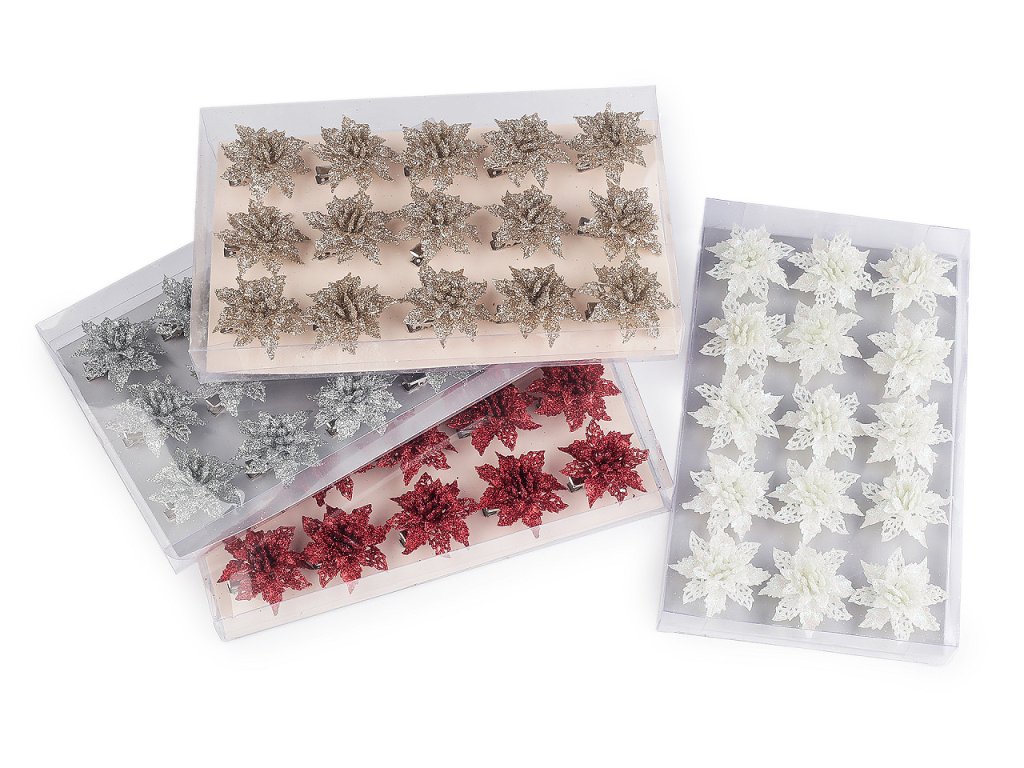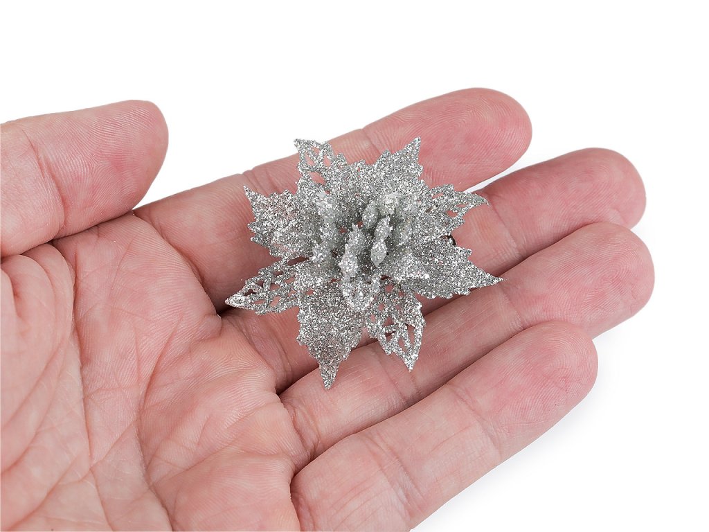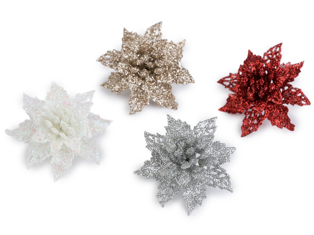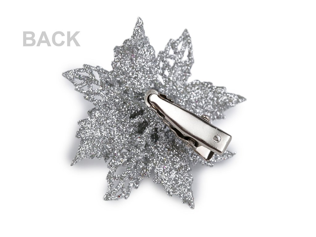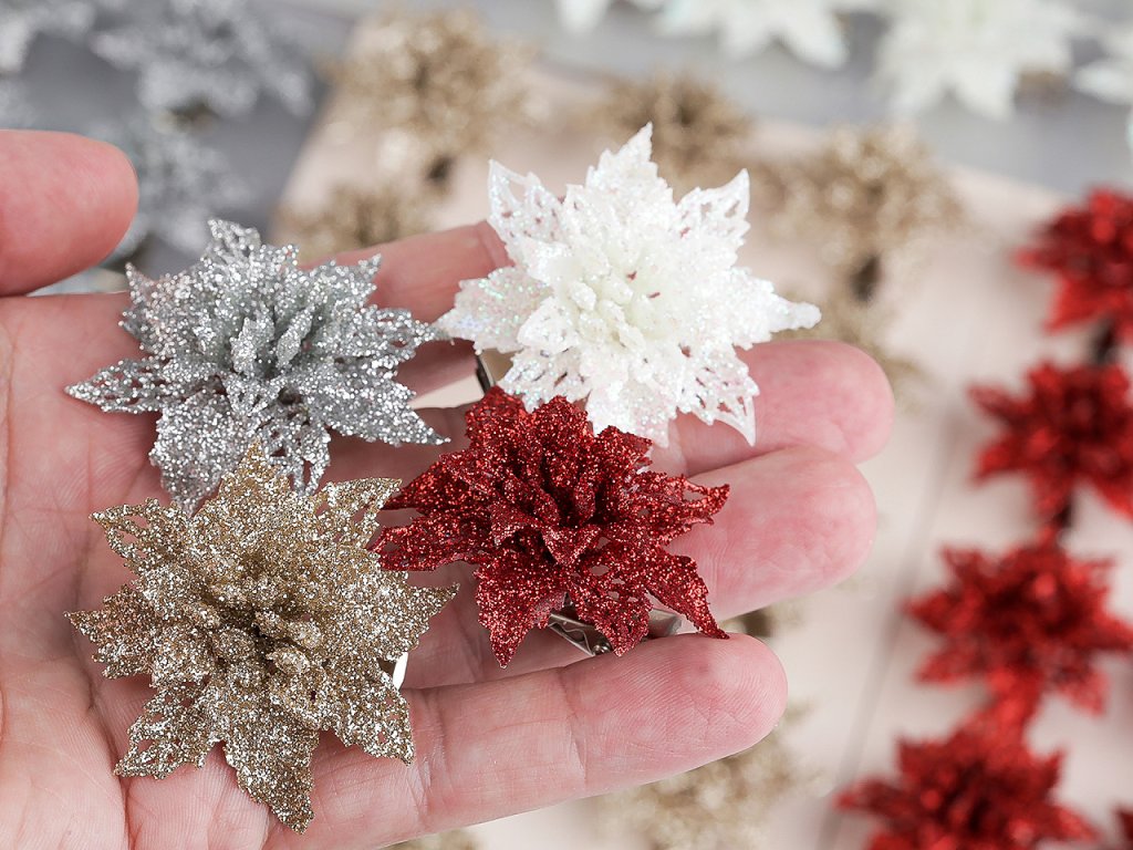 Vánoční hvězdy jsou poutavým detailem sváteční výzdoby. Jejich povrch se třpytivými glitry dodá vašemu domovu nádech elegance a luxusu. V dolní části je kovový klip, který umožňuje jednoduché připevnění na vánoční stromeček, věnce, dárky, svícny a různá aranžmá.