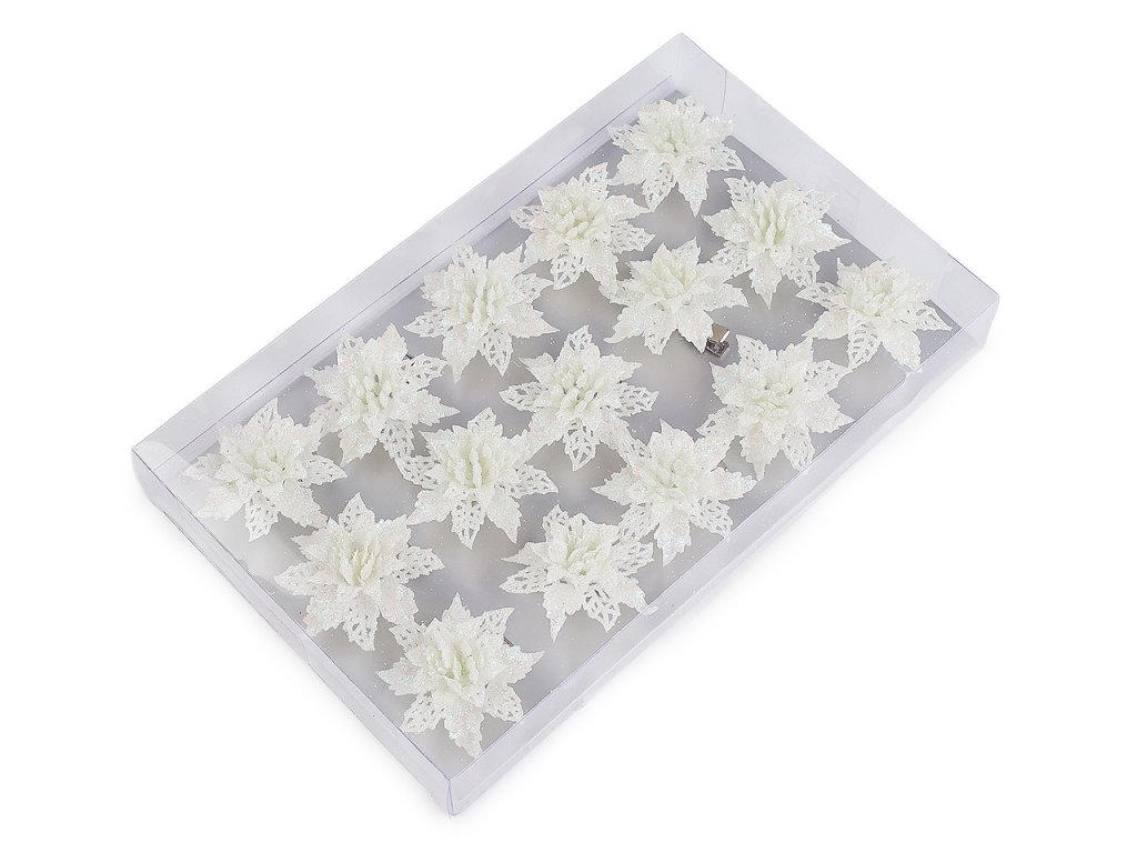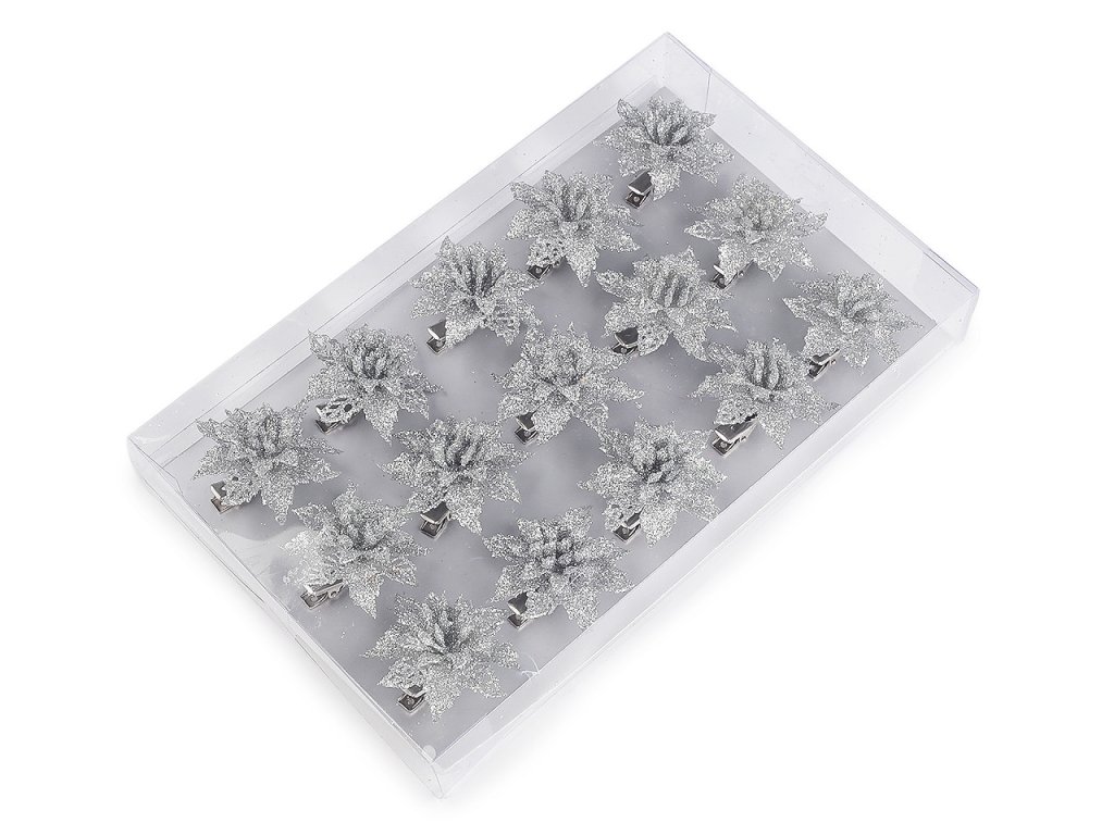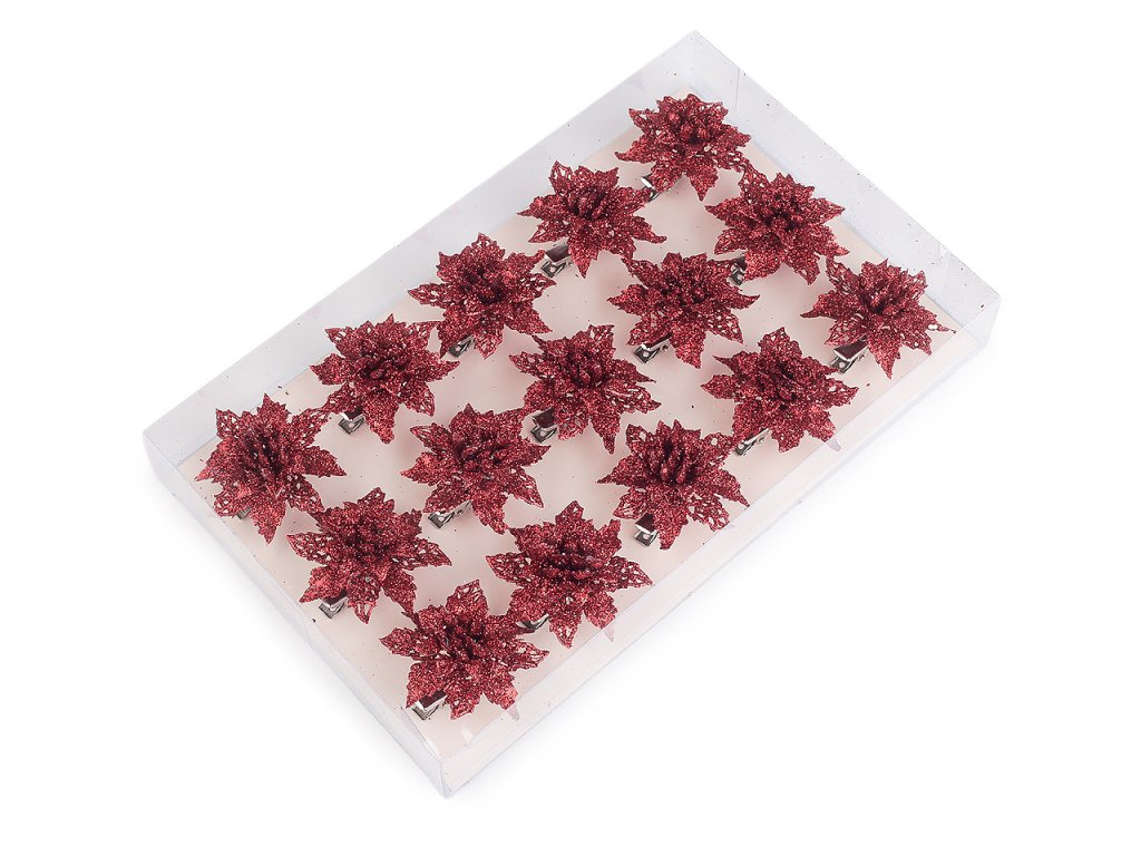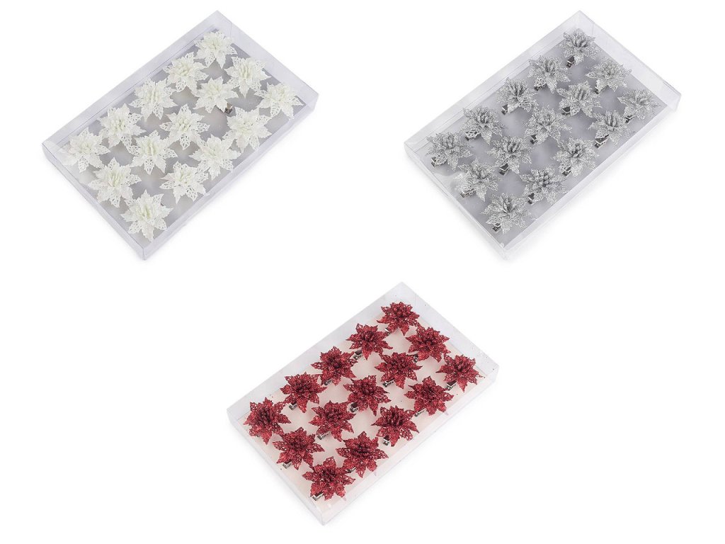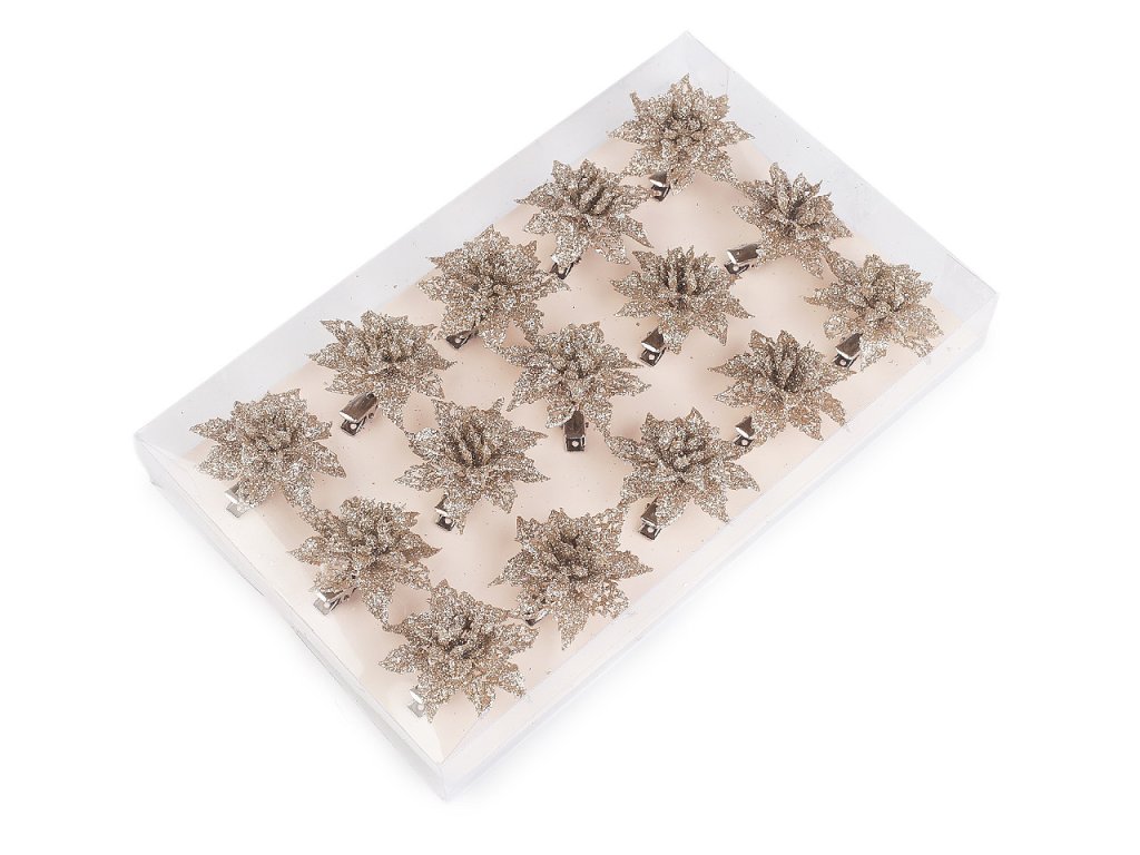 Vánoční hvězdy jsou poutavým detailem sváteční výzdoby. Jejich povrch se třpytivými glitry dodá vašemu domovu nádech elegance a luxusu. V dolní části je kovový klip, který umožňuje jednoduché připevnění na vánoční stromeček, věnce, dárky, svícny a různá aranžmá.