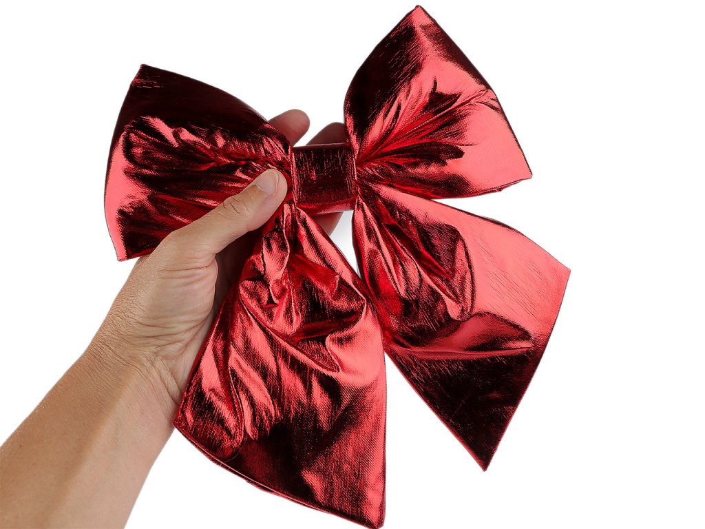 Vánoční mašle vyniká elegantním metalickým leskem a působivou velikostí. Je nadýchaná, bohatá, s pěnovou výztuhou uvnitř.