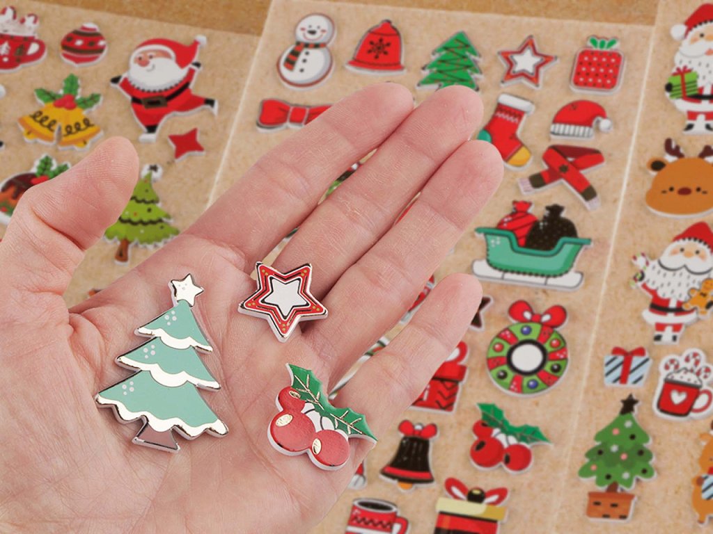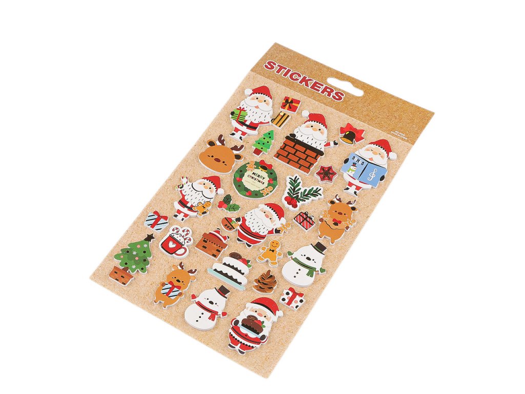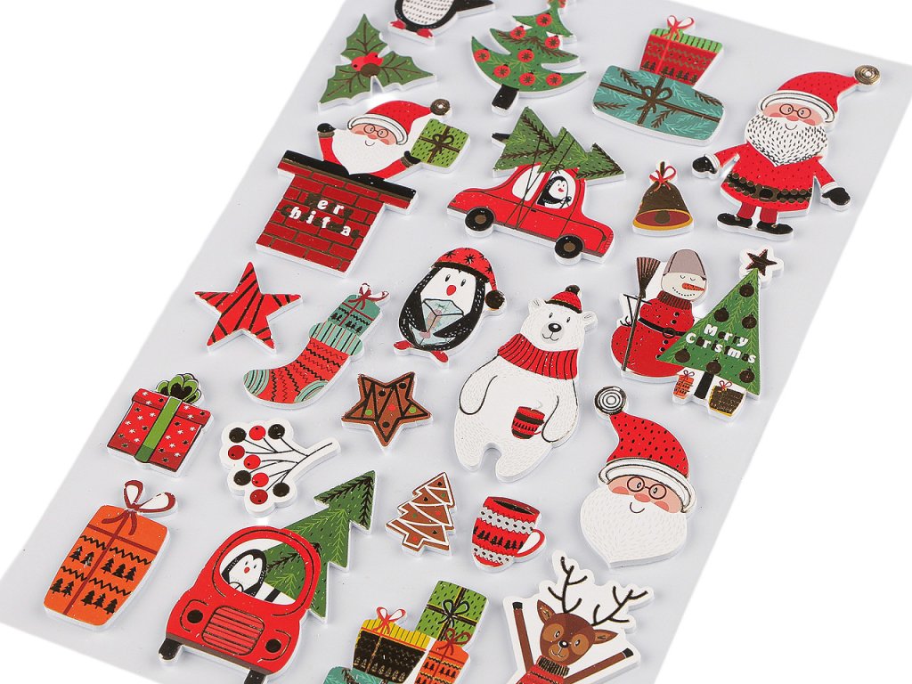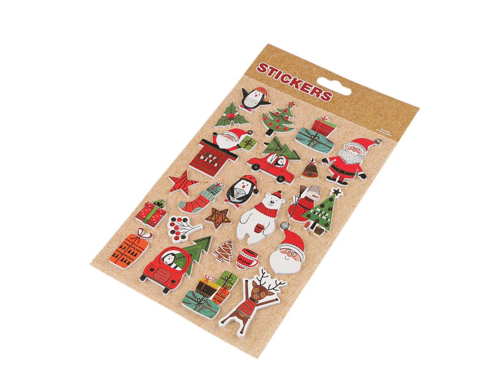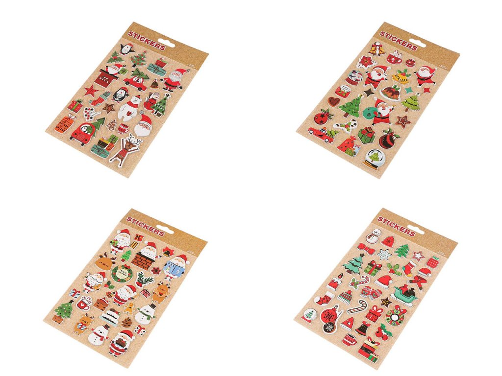 Samolepky s vánočními motivy mají kvalitní zpracování. Jsou plastické, se stylizovanými obrázky. Jsou oblíbené především dětmi ke zdobení dárků, přáníček, pozvánek, krabiček, fotoalb apod. S oblibou je využívají i učitelé jako motivační odměnu pro své žáky. Samolepky jsou nalepené na jednom archu transparentní podkladové folie, ze které je stačí sejmout.