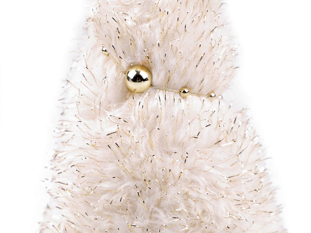 Dekorační stromeček zdobí umělá kožešinka s lurexem a korálky. Na špičce se třpytí glitrová hvězda.