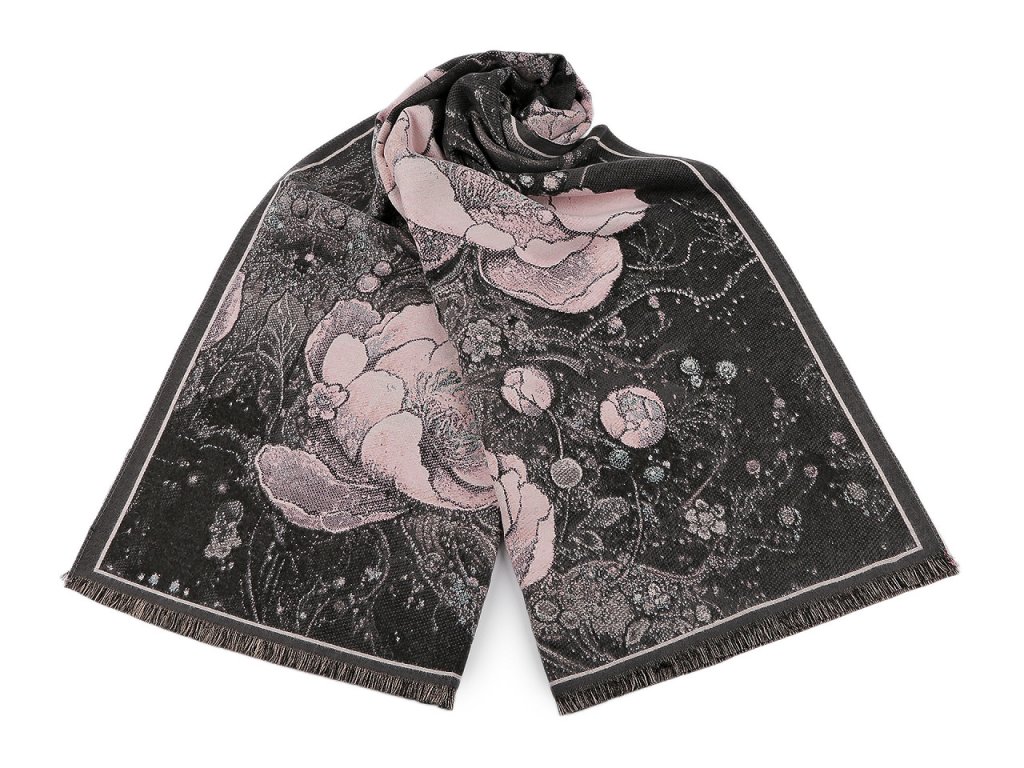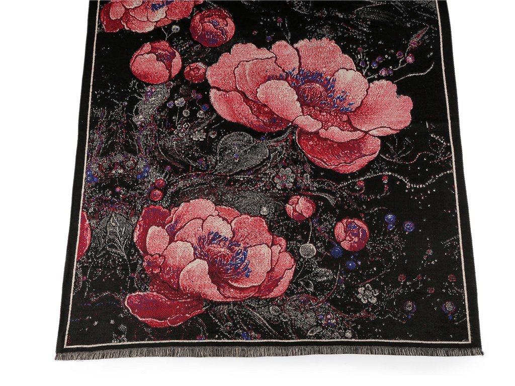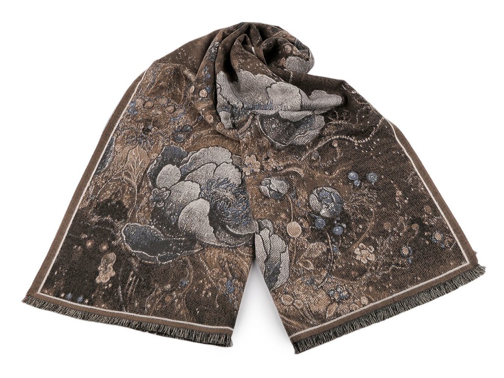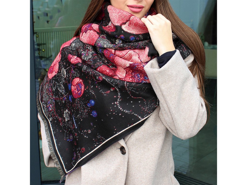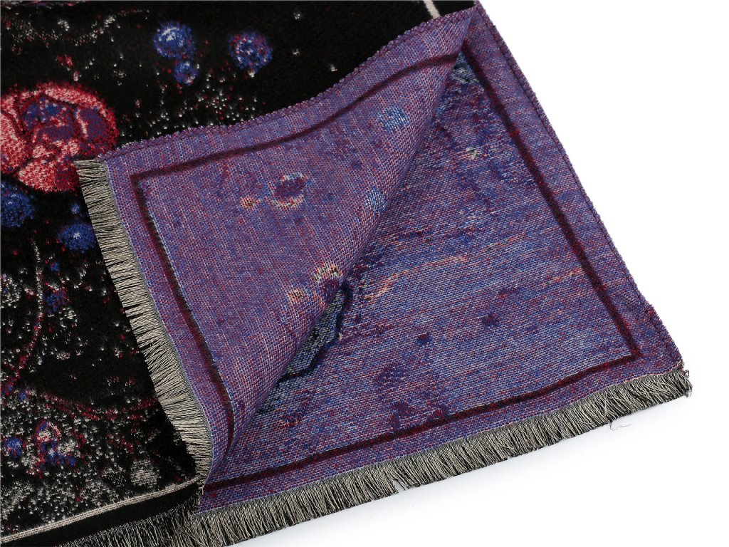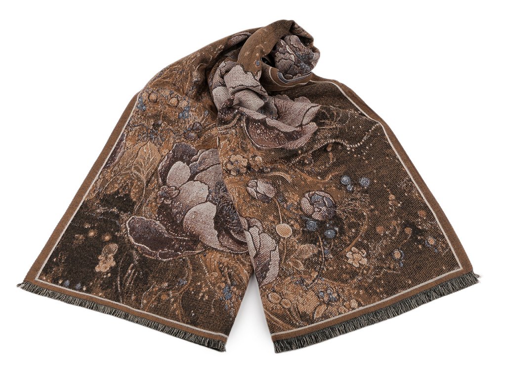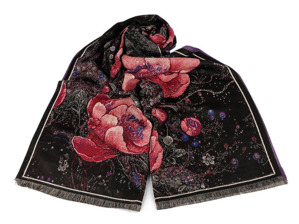Velký luxusní šátek typu kašmír je ozdobený květinovým motivem. Je vyrobený z hřejivého materiálu, který je příjemně hebký na dotek. Pefektně vás zahřeje v chladném a sychravém počasí. Hodí se ke kabátu, bundě i svetru. Na koncích je zakončený krátkými třásněmi.