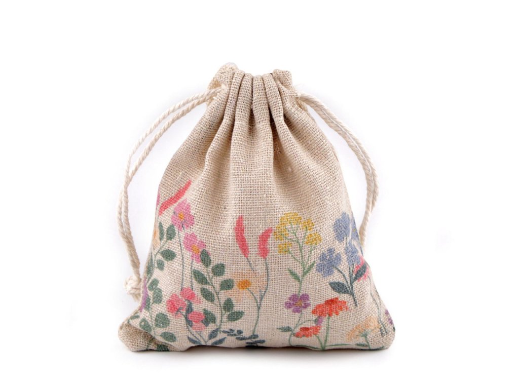 Lněný pytlík zdobí z jedné strany potisk stylizovaných květů. Je kvalitní a pevný, snadno se uzavírá pomocí dvou stahovacích bavlněných šňůrek. Využijete ho celoročně k balení menších dárků, k balení velikonoční výslužky pro koledníky i k jarnímu aranžování.