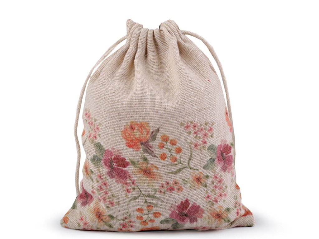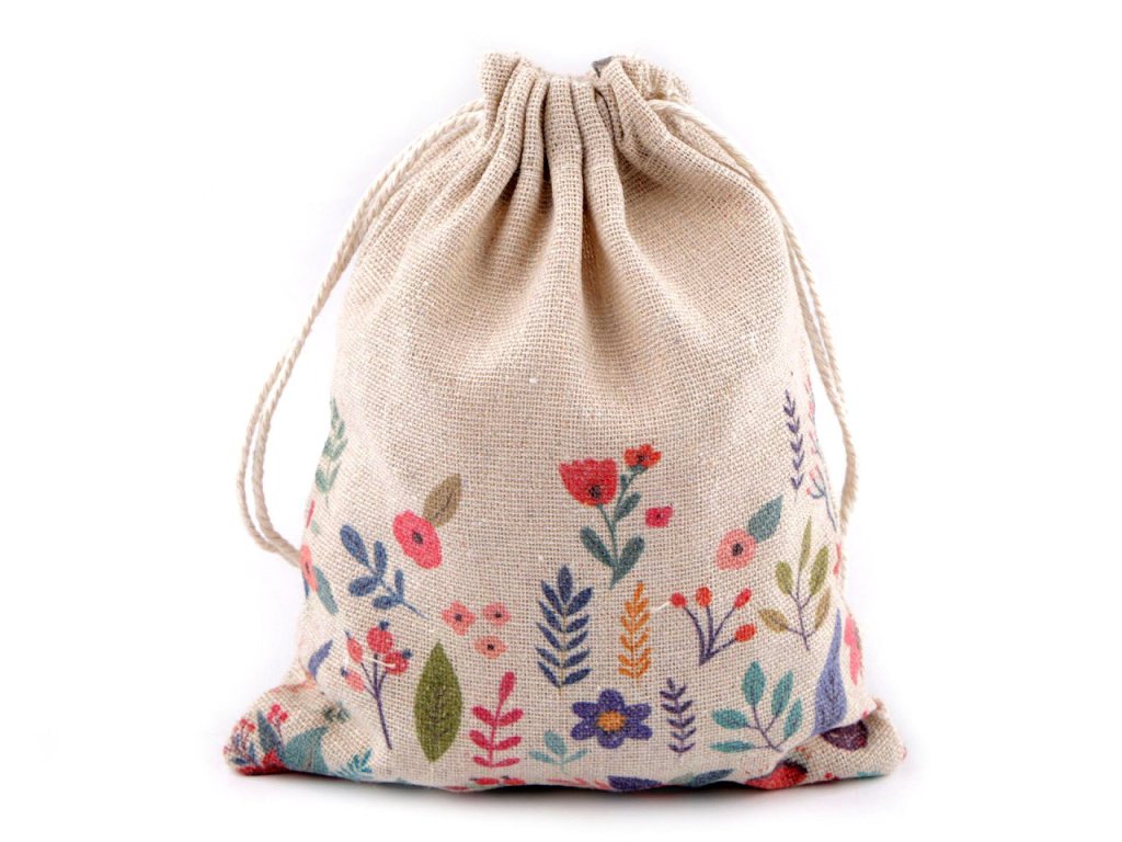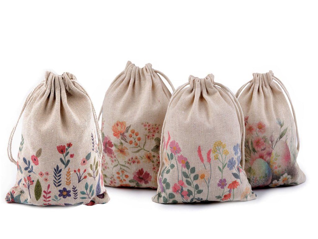 Lněný pytlík zdobí z jedné strany jarní potisk. Je kvalitní a pevný, snadno se uzavírá pomocí dvou stahovacích bavlněných šňůrek. Využijete ho celoročně k balení menších dárků, k balení velikonoční výslužky pro koledníky i k jarnímu aranžování.