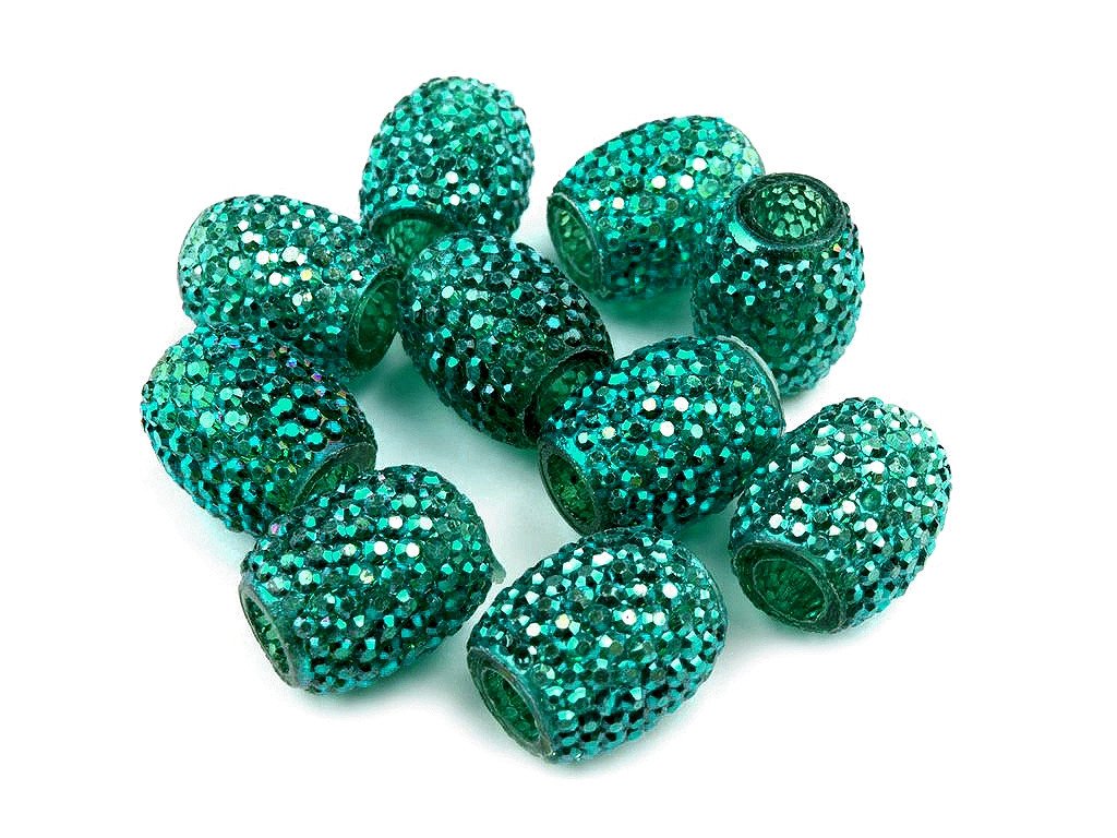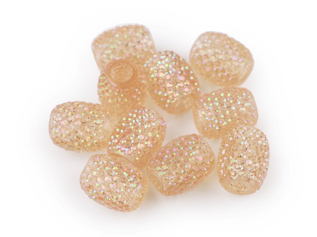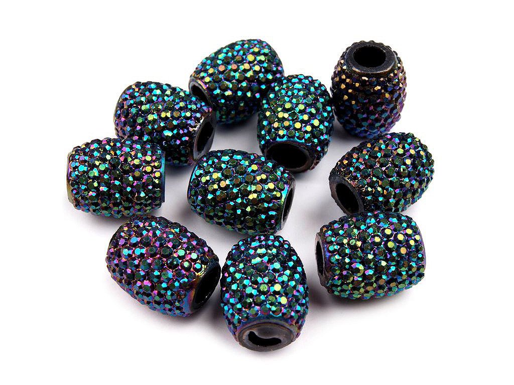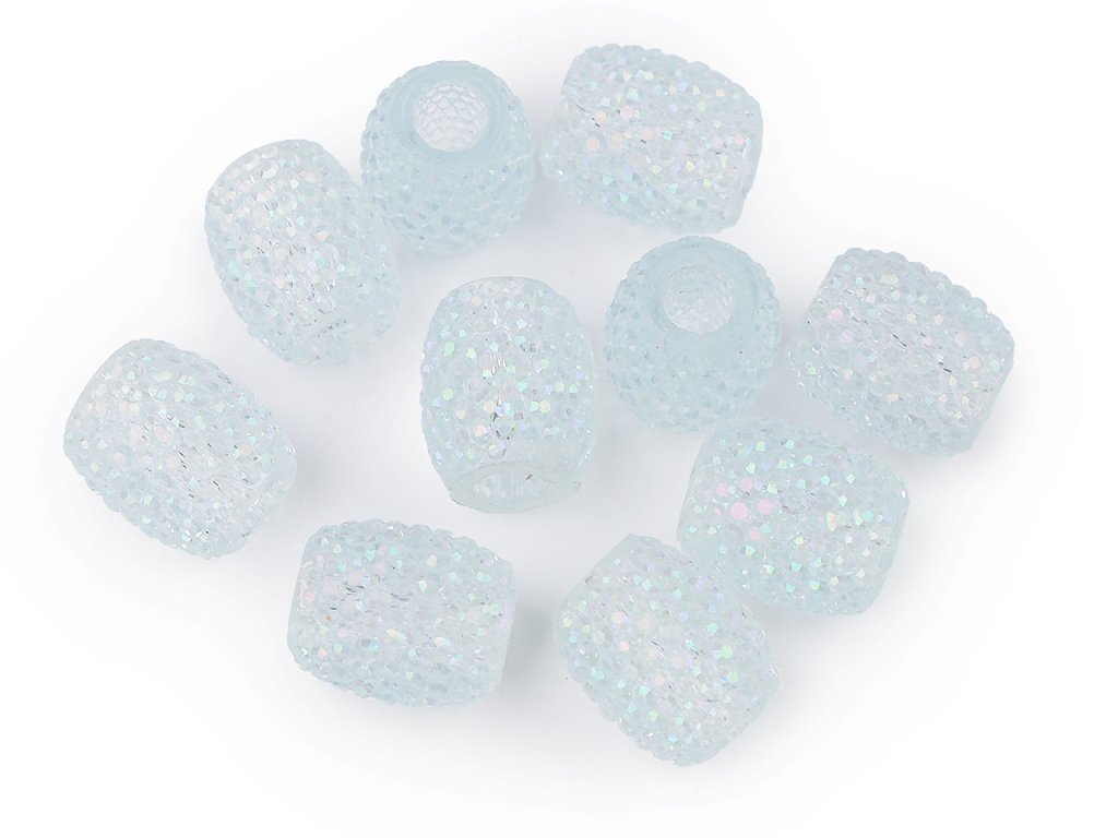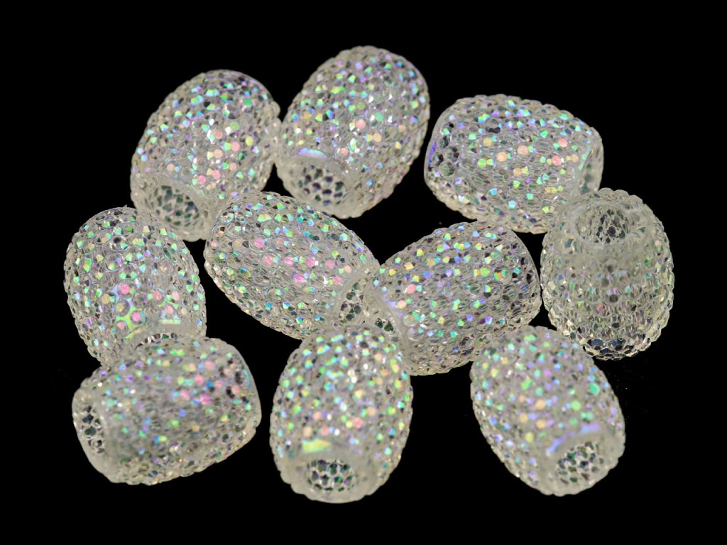 Transparentní korálky s velkým průvlekem ve tvaru olivy mají díky drobných plošek výrazný lesk. Navíc mají povrch s AB efektem, jenž způsobuje vysoký duhový třpyt korálku.