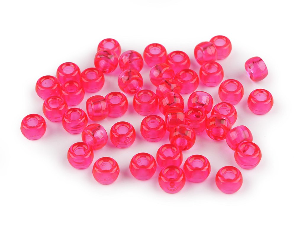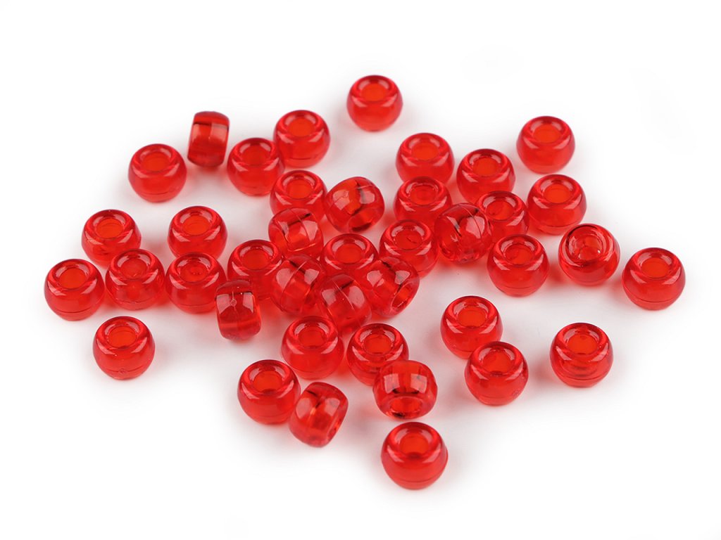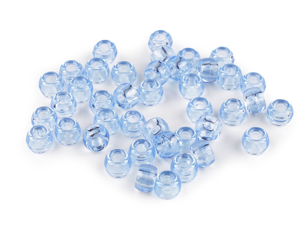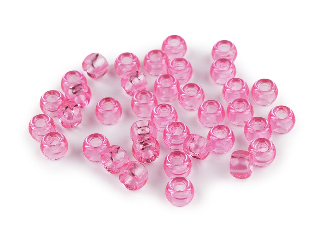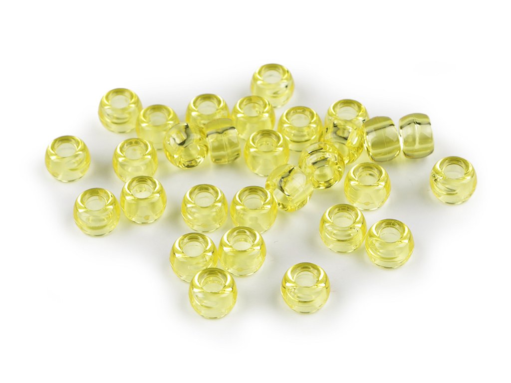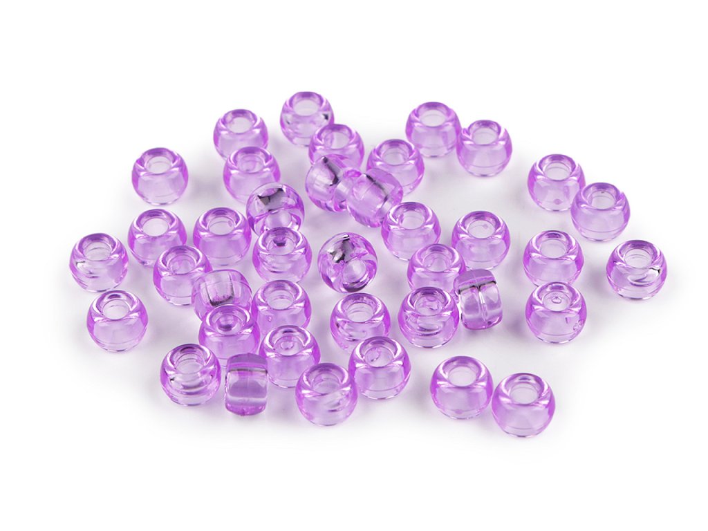 Transparentní plastové korálky s velkým průvlekem využijete do krátkých i dlouhých náhrdelníků nebo náramků. Nejsou kulaté, mají tvar nízkého okrouhlého válečku. Jejich velikou výhodou je lehký materiál a větší průvlek. Jako návlekový materiál jsou vhodné šperkové šňůrky. Korálky můžete navlékat na větší množství tenkých šňůrek, které se mezi sebou různě uzlují a svazují a tvoří tak zajímavý celek. Korálky využijete nejen k výrobě bižuterie, ale i ke zdobení oděvů, tašek nebo plavek.