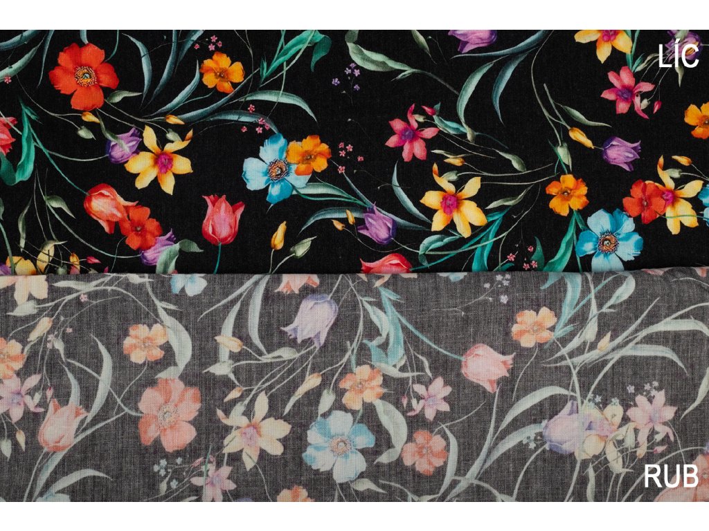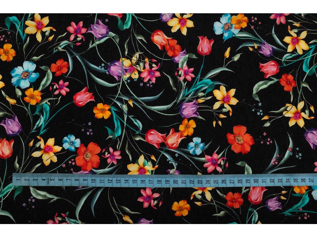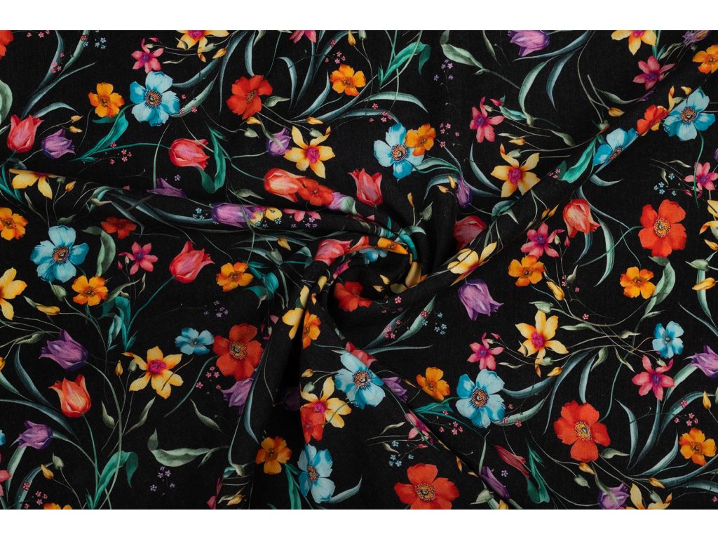 Viskózová tkanina barevné květy na černé