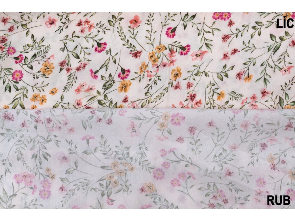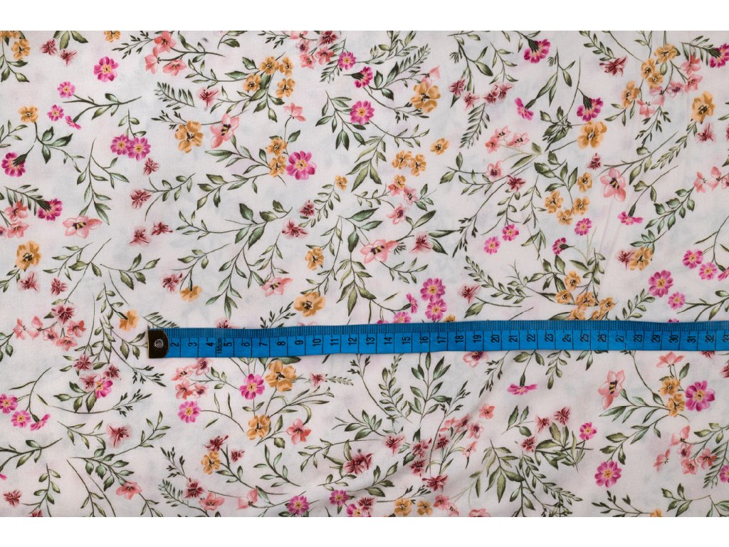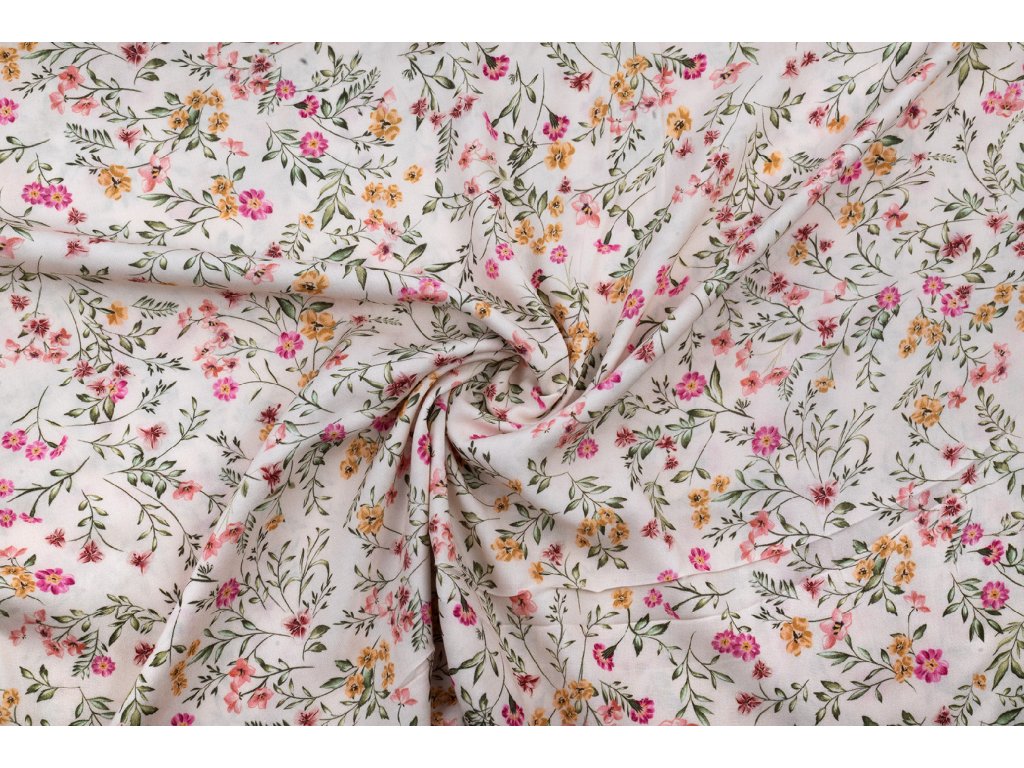 Viskózová tkanina růžové a žluté kvítí na bílé