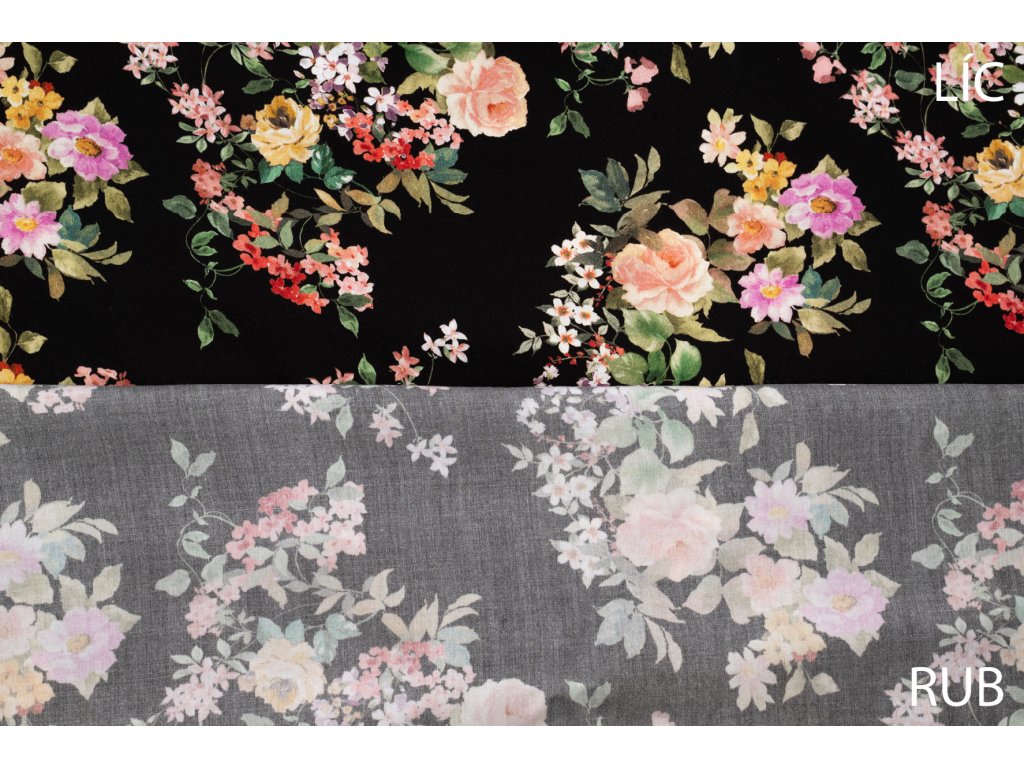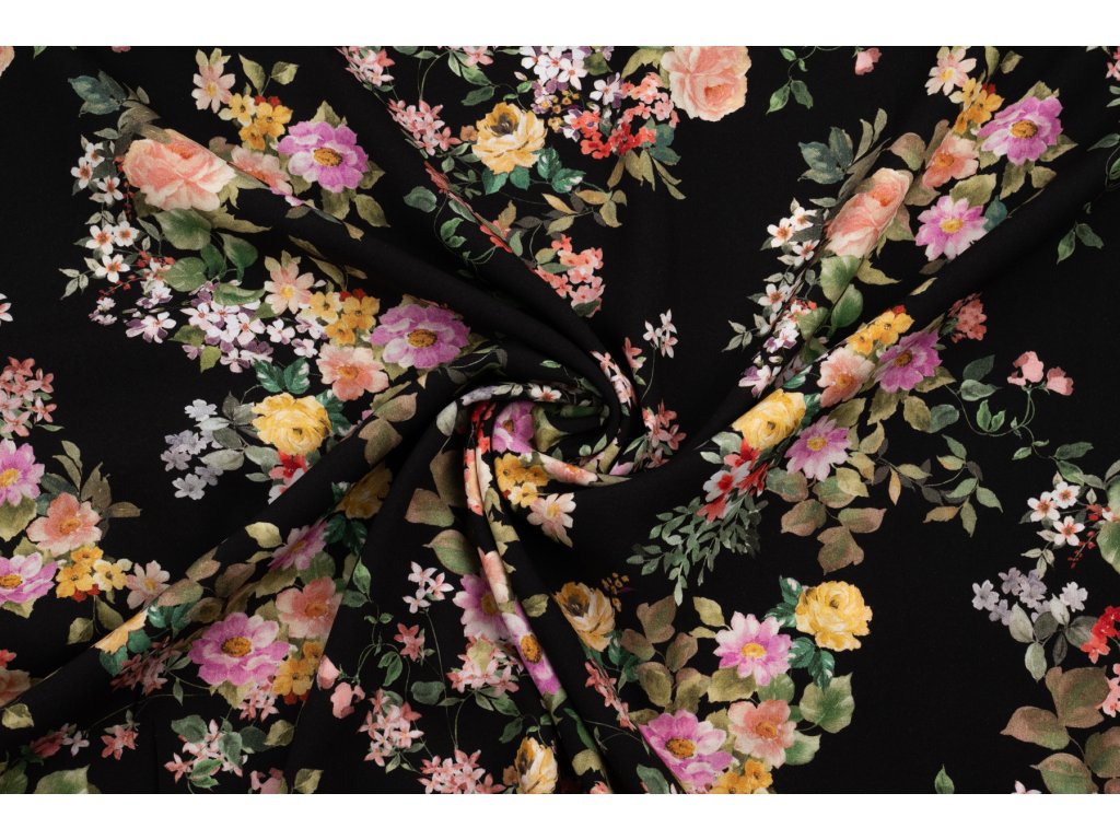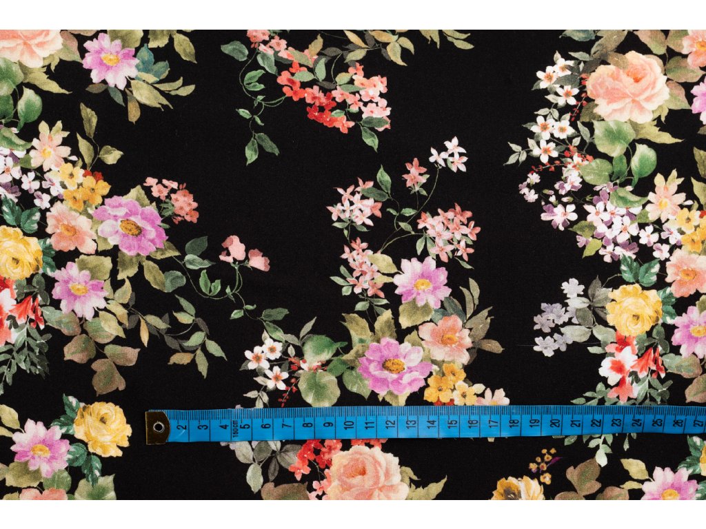 Viskózová tkanina zahradní růže na černé