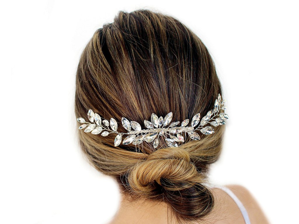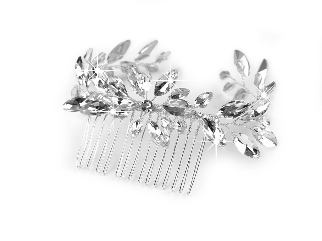 Kovový hřeben do vlasů je ozdobený květem a větvičkami z broušených kamínků. Je velice poutavý, oslní na každé slavnostní události, protože se třpytí už z velké dálky. Je vhodný do společenských účesů i pro nevěsty v jejich den. Samotný hřeben je rovný, ozdoba se dá díky pevných drátků vytvarovat. V účesu hřeben pevně drží.
