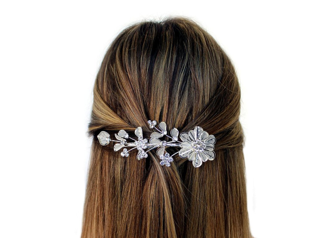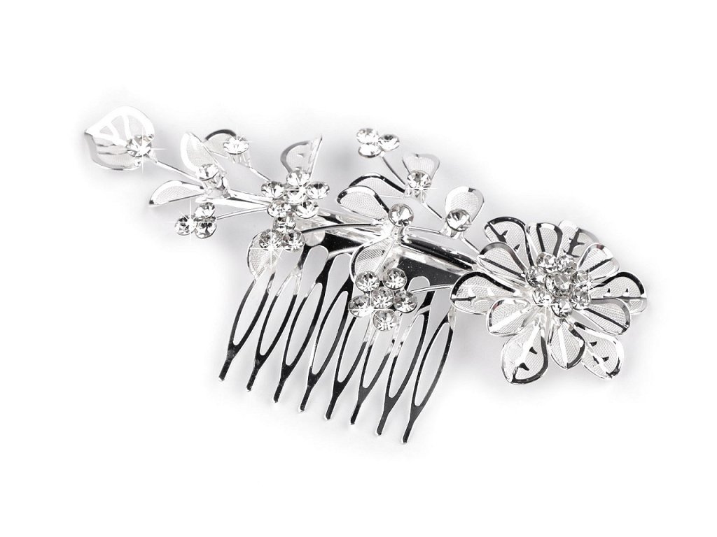 Kovový hřeben do vlasů s kovovým květem s větvičkou je ozdobený broušenými kamínky, díky kterým se poutavě třpytí. Oslní na každé slavnostní události ve společenském účesu, ale je vhodný i na běžné nošení. Samotný hřeben je rovný, ozdoba je jemně prohnutá. V účesu hřeben pevně drží.