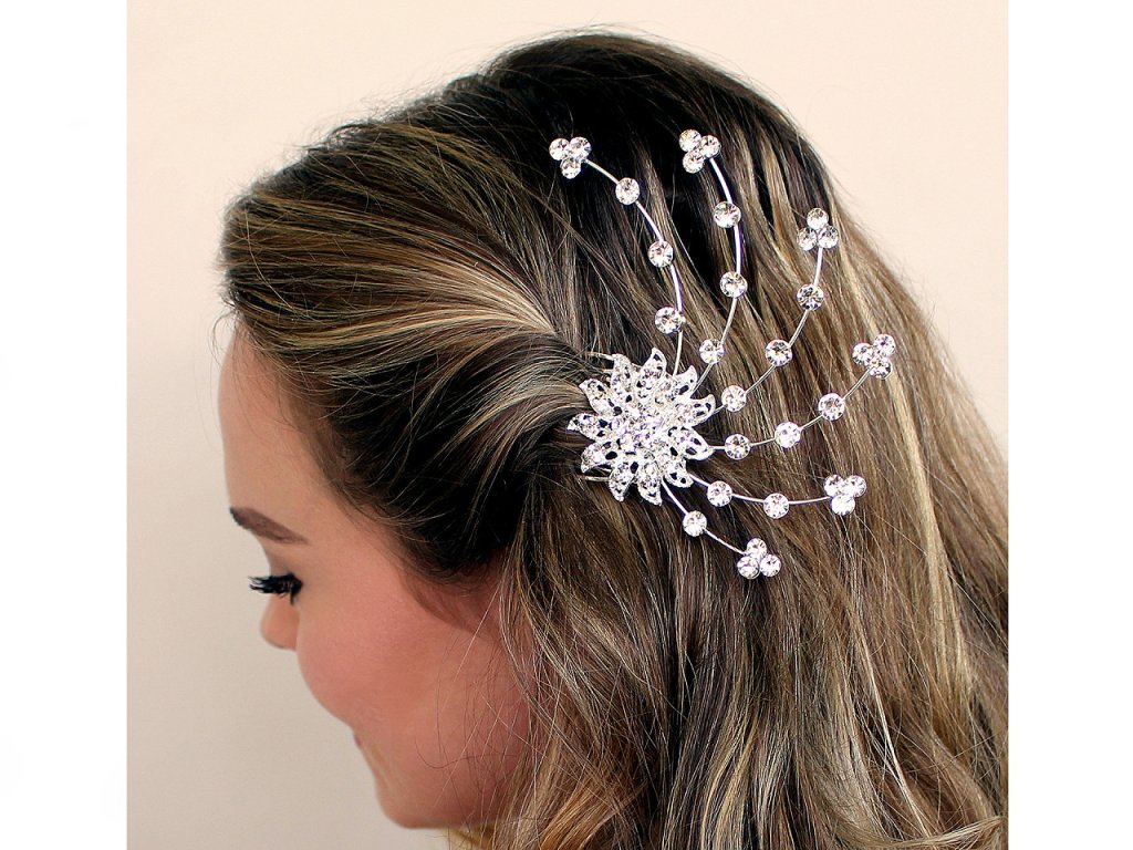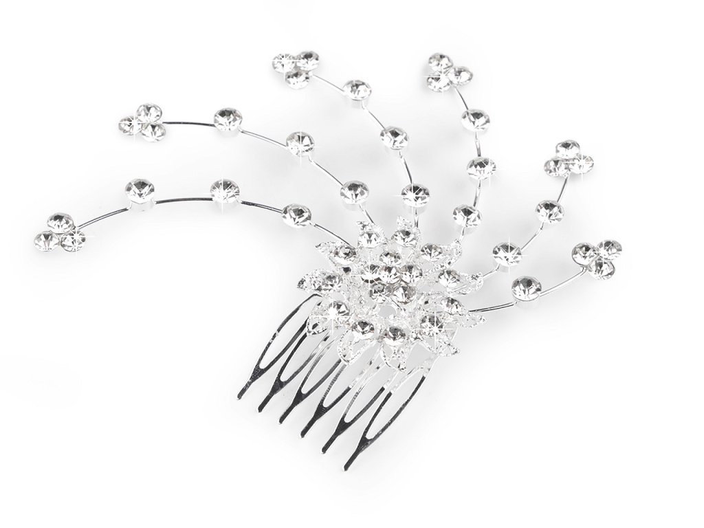 Kovový hřeben do vlasů je ozdobený velkým květem a kaskádou s broušenými kamínky. Je velice poutavý, oslní na každé slavnostní události, třpytí se už z dálky. Je vhodný do společenských účesů i pro nevěsty v jejich den. Hřeben i ozdoba je rovná. V účesu hřeben pevně drží.