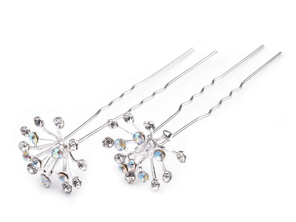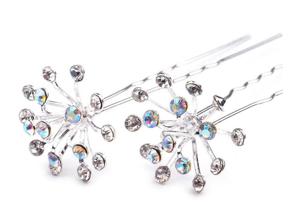 Elegantní vlásenky Ø20mm, které každý účes povýší nejméně o dvě třídy výš. Délka vlásenky 65mm je bez ozdoby, ozdoba má výšku 10mm. Kamínky jsou skleněné, broušené, takže se na slunci i umělém světle budou jemně blýskat, což výsledný dojem ještě umocní. Ozdobí společenské účesy i nevěsty v jejich den...