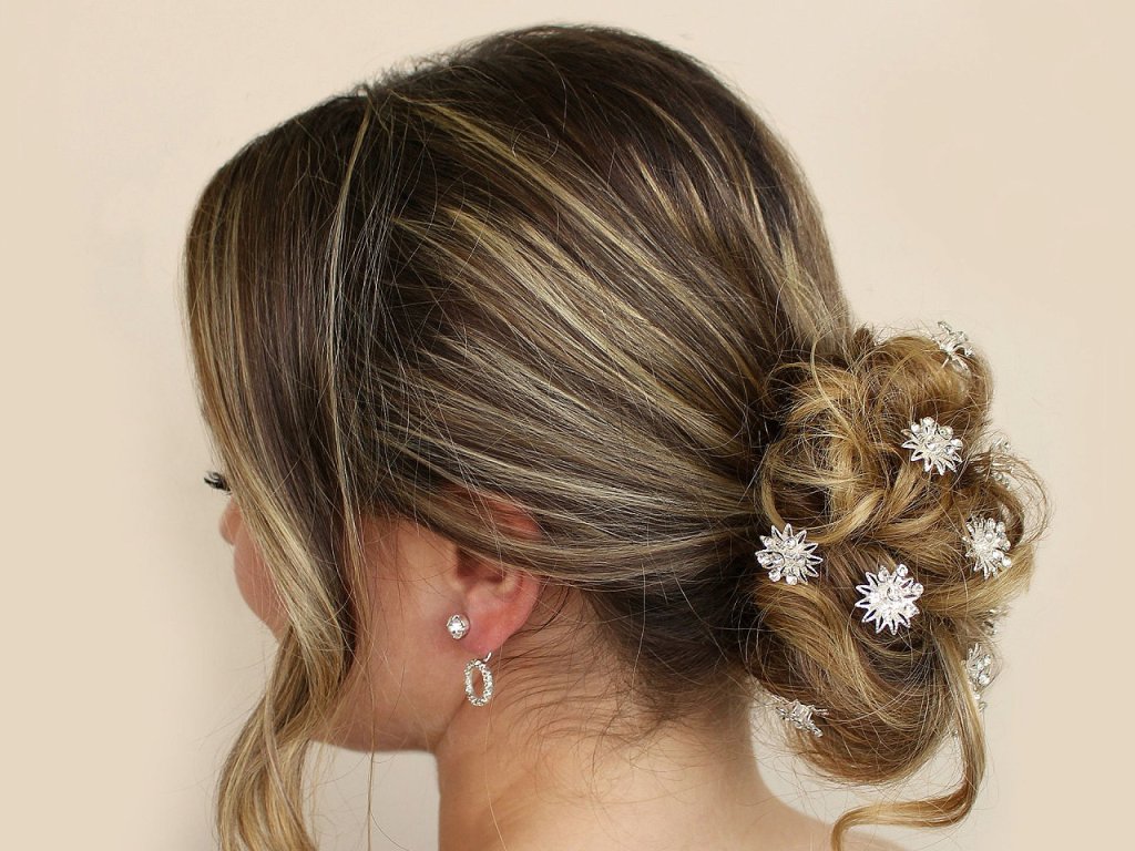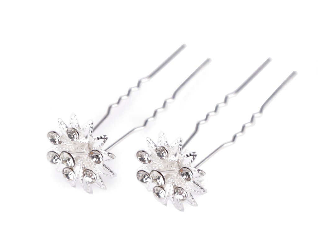 Elegantní štrasové vlásenky ve tvaru květu každý účes vyzdvihnou nejméně o dvě třídy výš. Broušené kamínky se jemně třpytí, jsou zasazené do kovového lůžka. Vlásenky jsou z kvalitního, pevného kovu, ozdobí nejen společenské účesy, ale i nevěsty v jejich velký den.