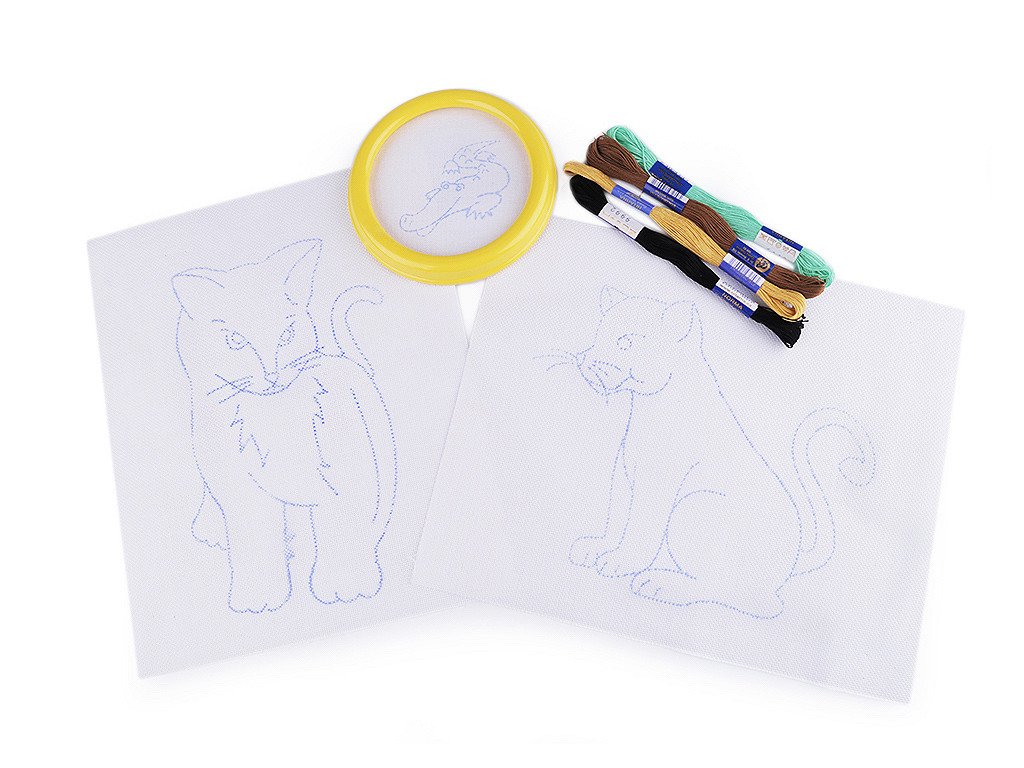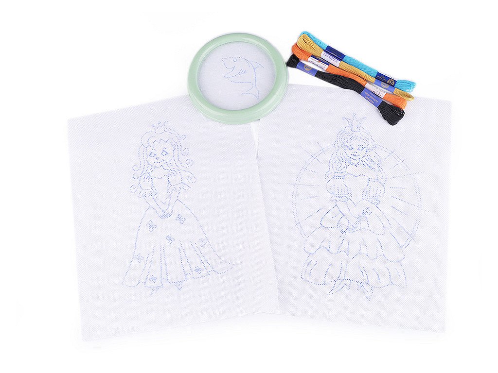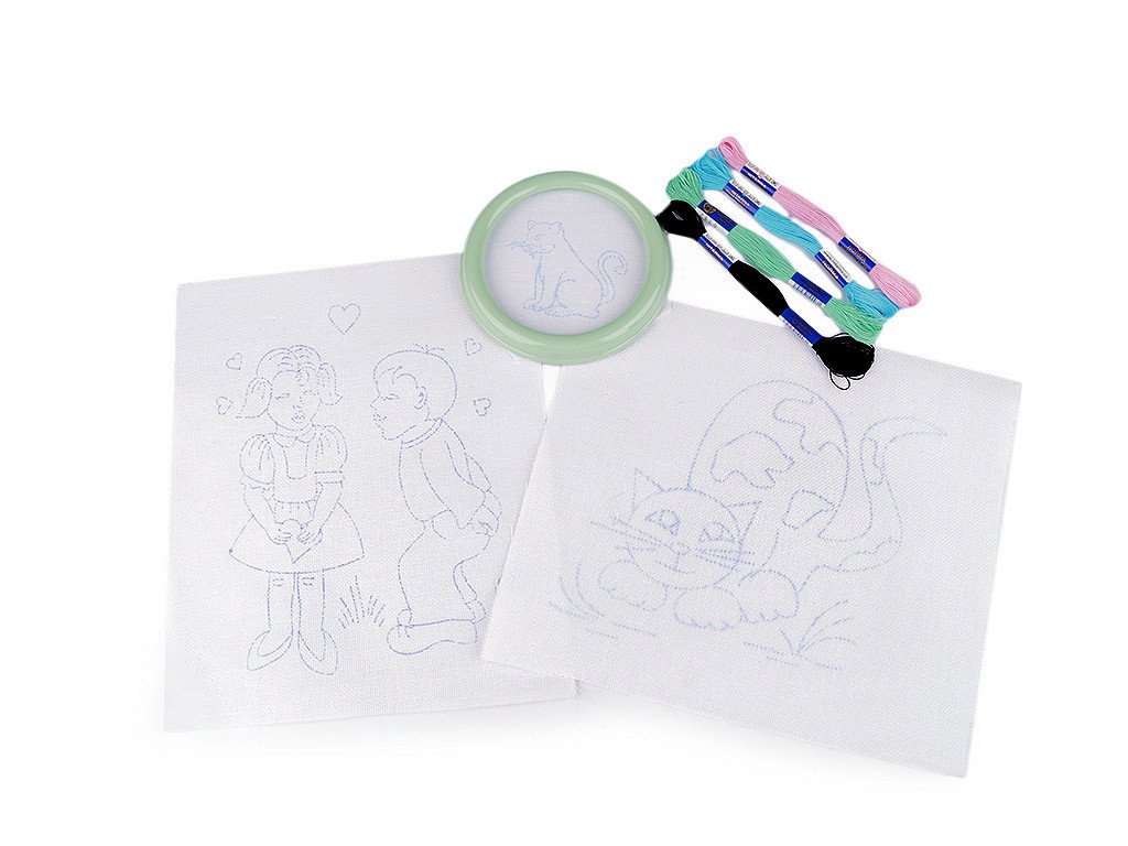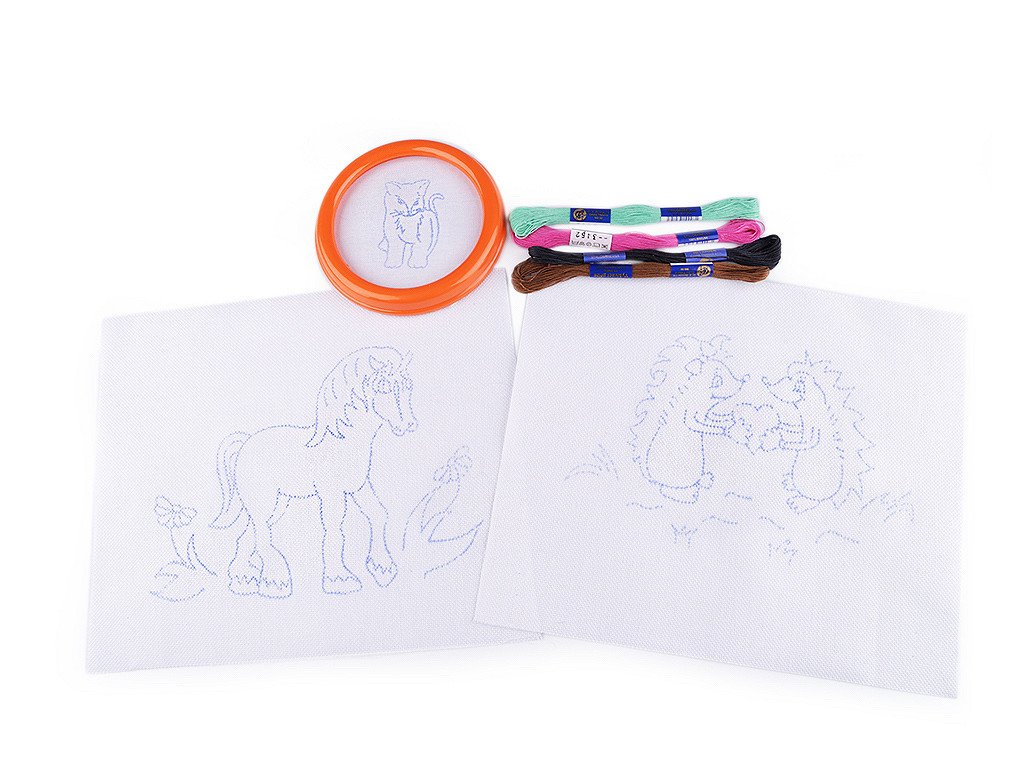 Zabavte vaše šikovné děti vyšíváním. Souprava dětského vyšívání obsahuje kulatý rámeček s látkou, která má předtištěný vzor, 4 kvalitní vyšívací příze mouline ze 100% bavlny a dvě větší plátna (23 x 26 cm) s předtištěnými motivy.