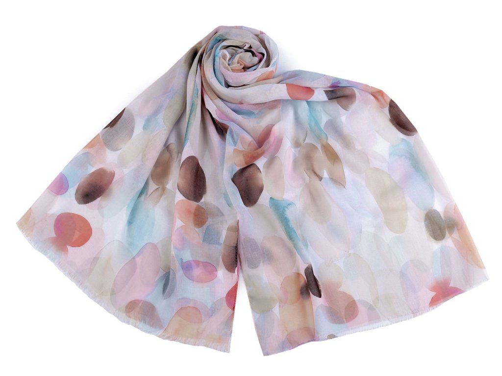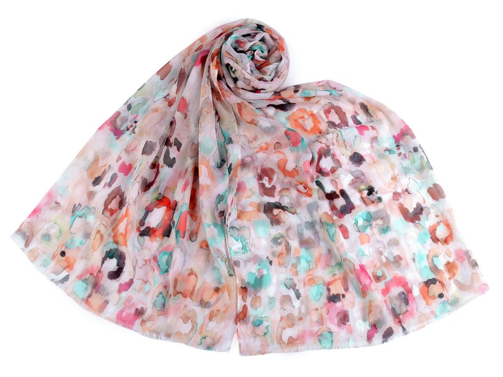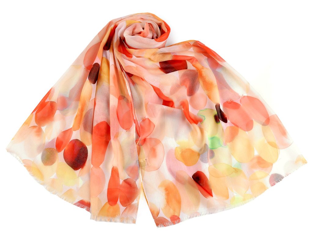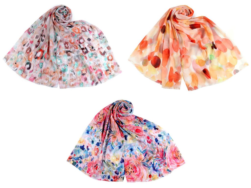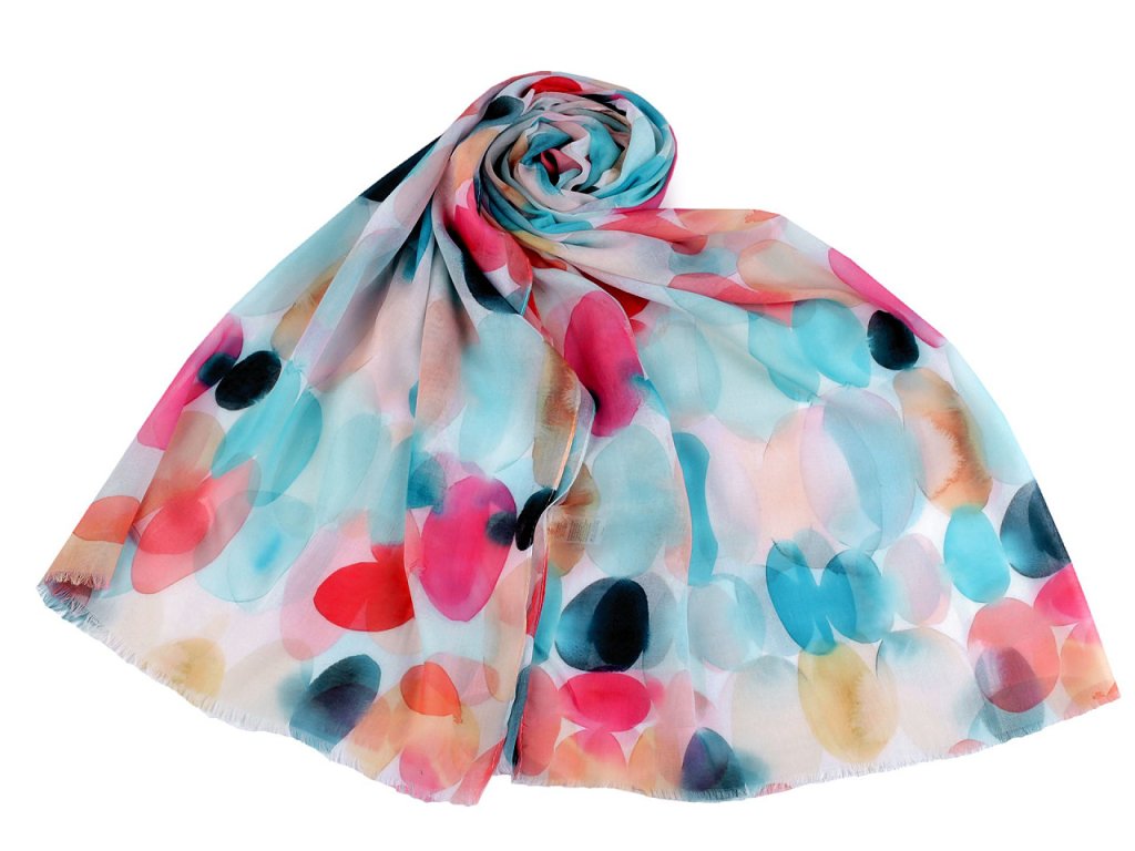 Šátek s barevným vzorem je vzdušný a lehounký, velice příjemný na dotek. Je jemně průsvitný, na koncích má malé třásně. Doladí váš outfit, ať už si vezmete sako, halenku, svetřík či šaty.