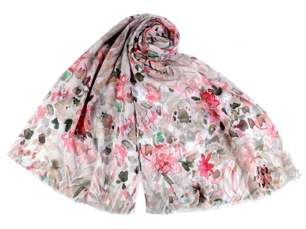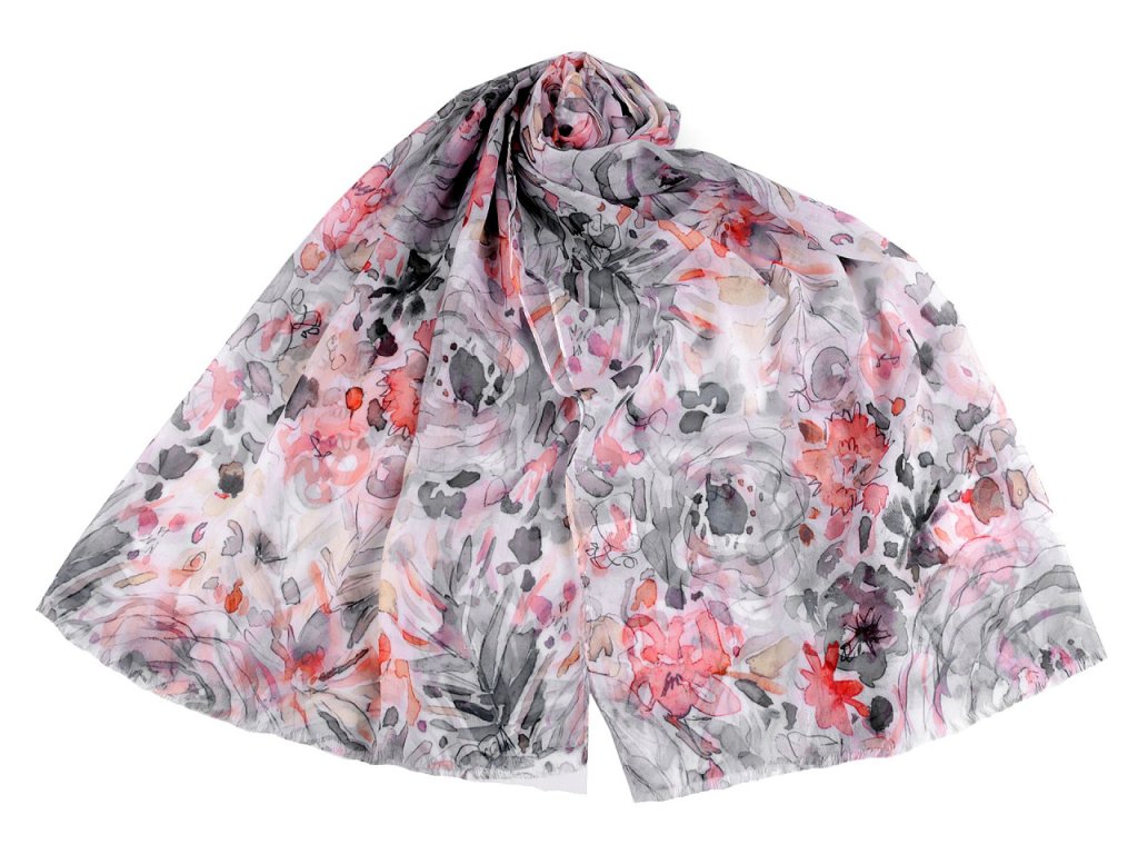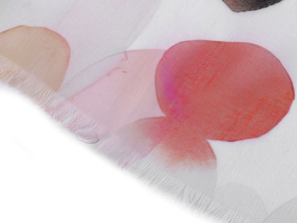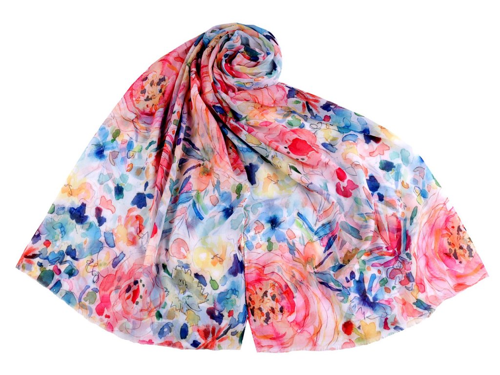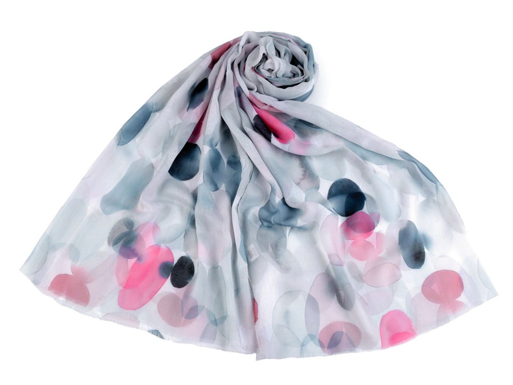 Šátek s barevným vzorem je vzdušný a lehounký, velice příjemný na dotek. Je jemně průsvitný, na koncích má malé třásně. Doladí váš outfit, ať už si vezmete sako, halenku, svetřík či šaty.