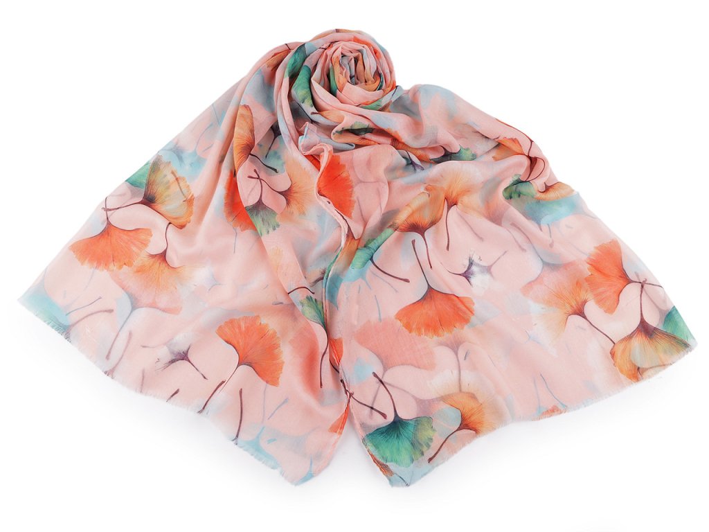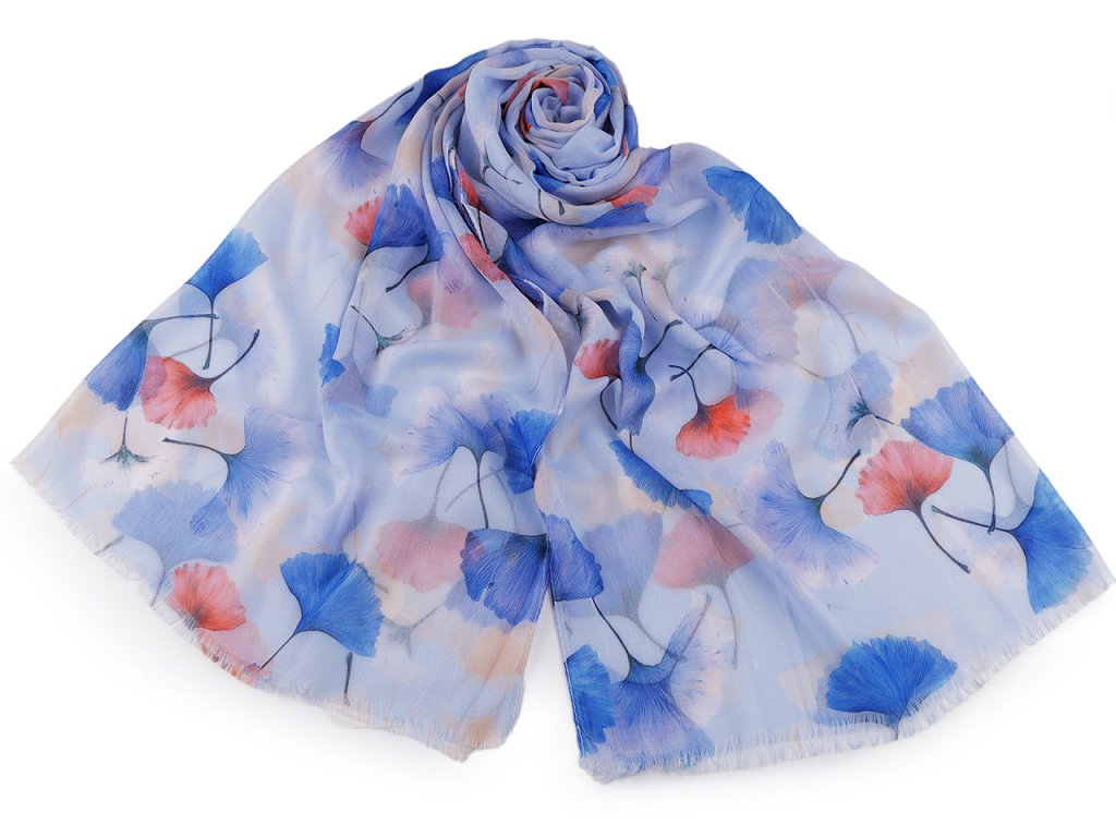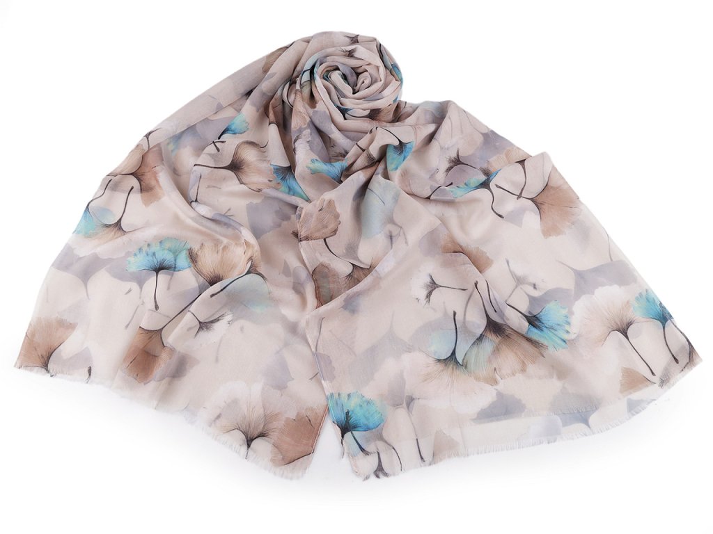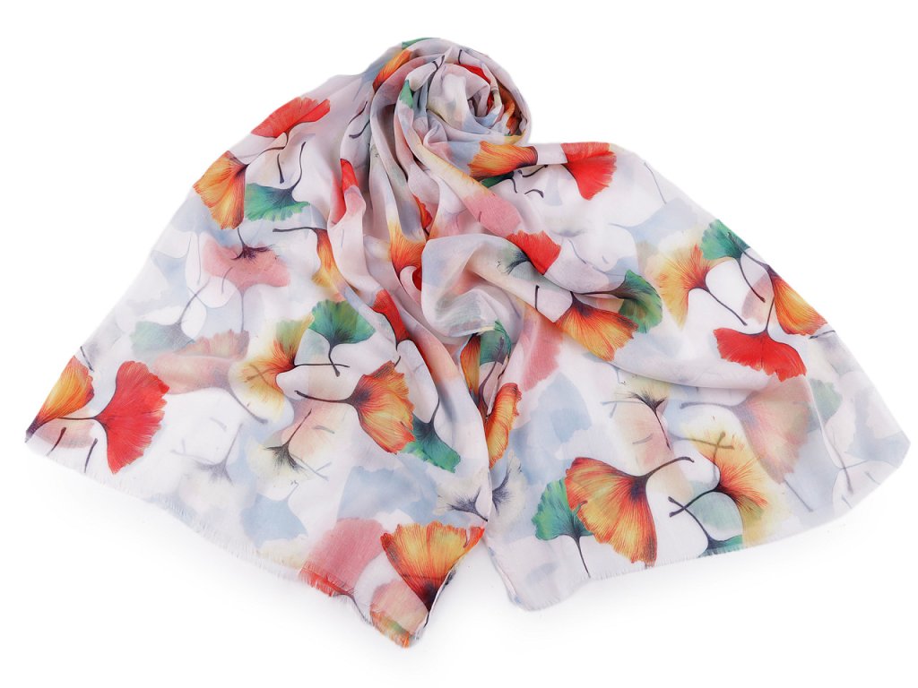 Šátek s oblíbeným vzorem listů ginkgo je vzdušný a lehounký, velice příjemný na dotek. Je jemně průsvitný, na koncích má malé třásně. Doladí váš outfit, ať už si vezmete sako, halenku, svetřík či šaty.