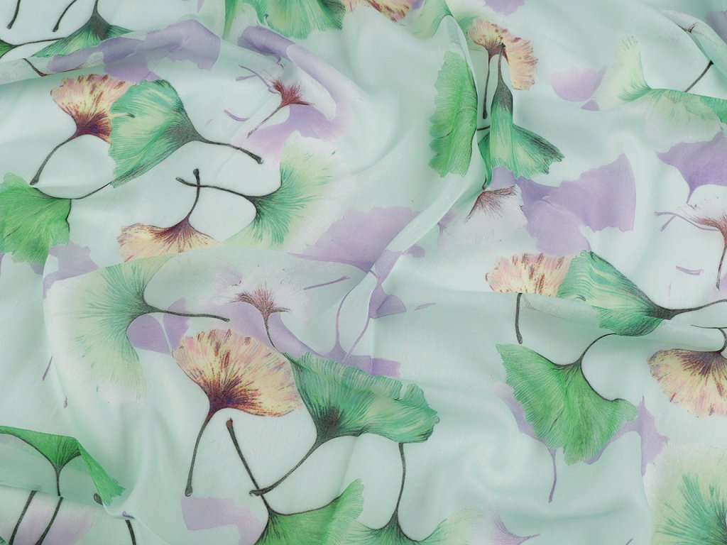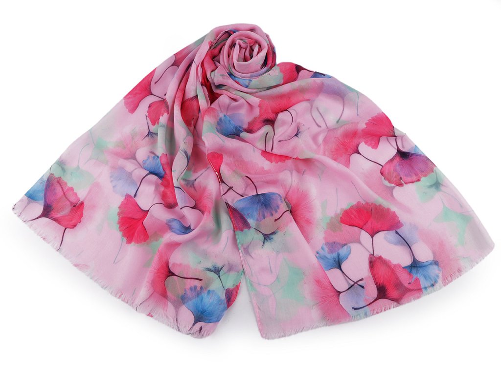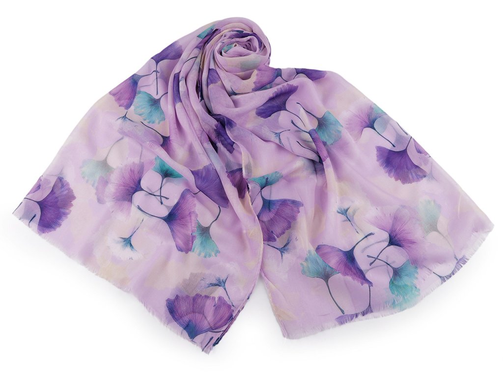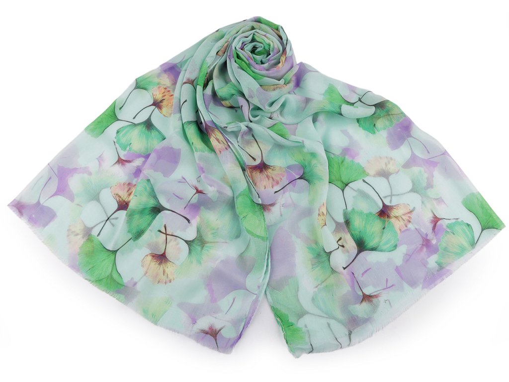 Šátek s oblíbeným vzorem listů ginkgo je vzdušný a lehounký, velice příjemný na dotek. Je jemně průsvitný, na koncích má malé třásně. Doladí váš outfit, ať už si vezmete sako, halenku, svetřík či šaty.