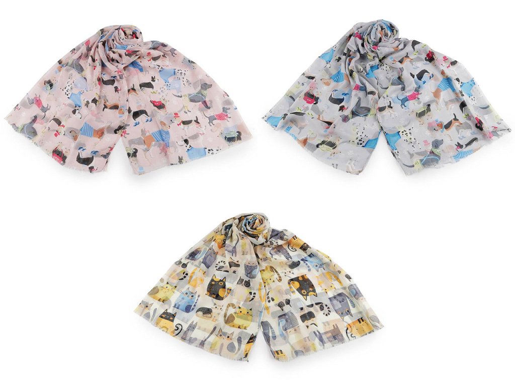 Šátek s motivem psů nebo koček je vzdušný a lehounký, velice příjemný na dotek. Je jemně průsvitný, na koncích má malé třásně. Doladí váš outfit, ať už si vezmete sako, halenku, svetřík či šaty.