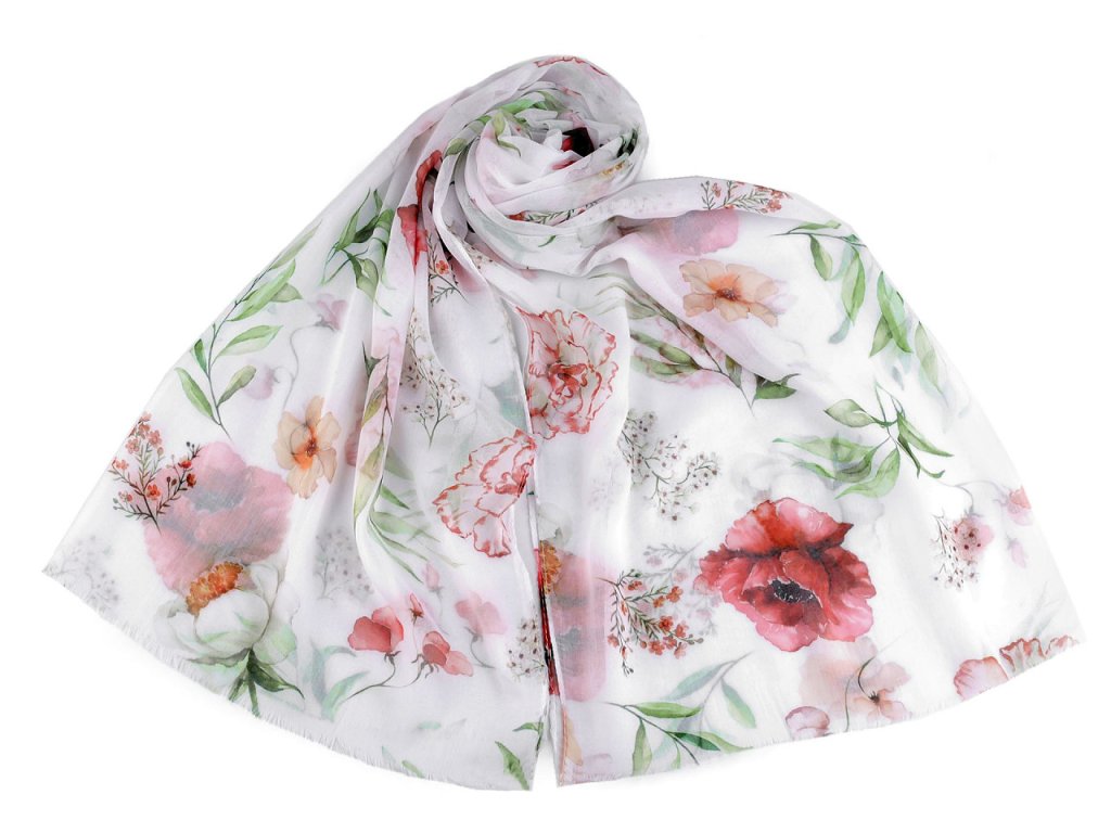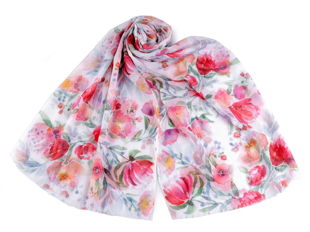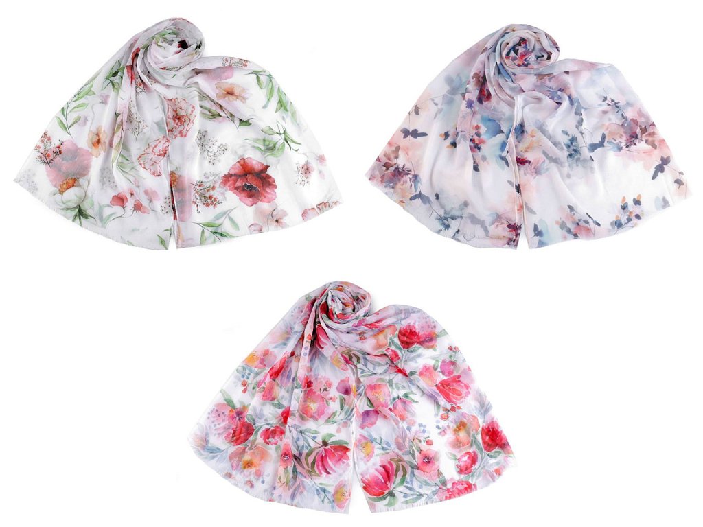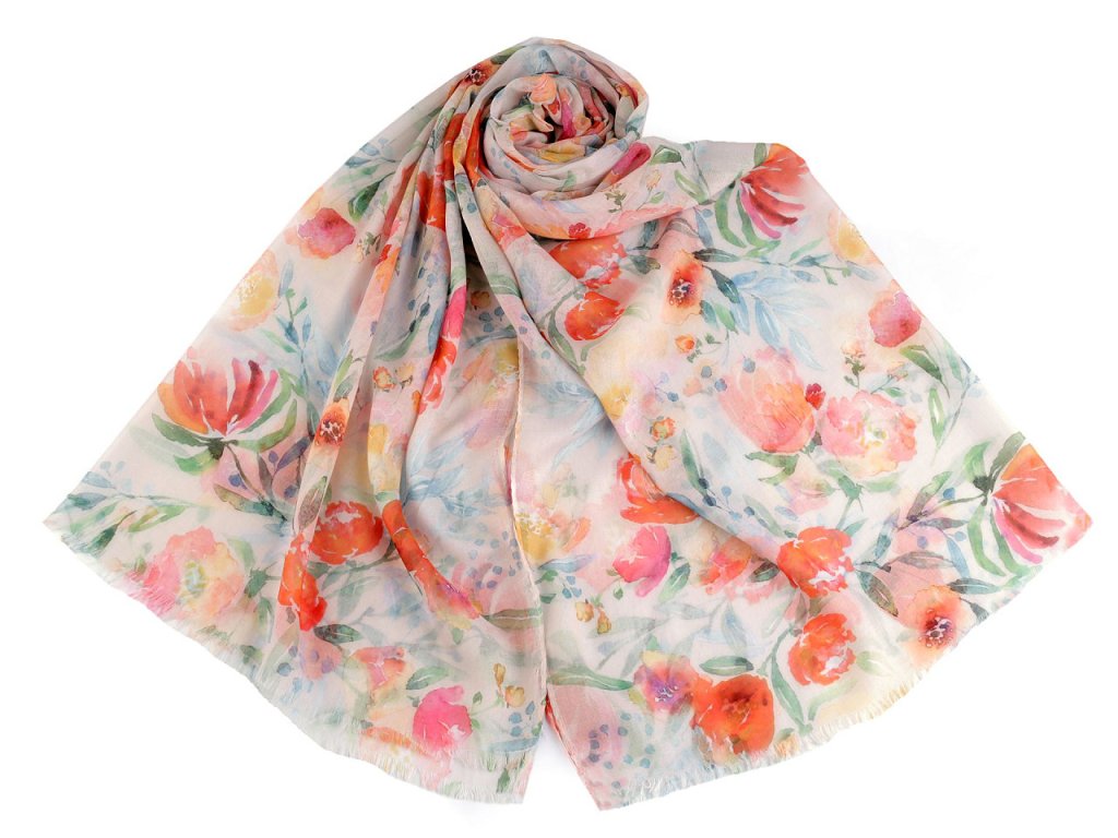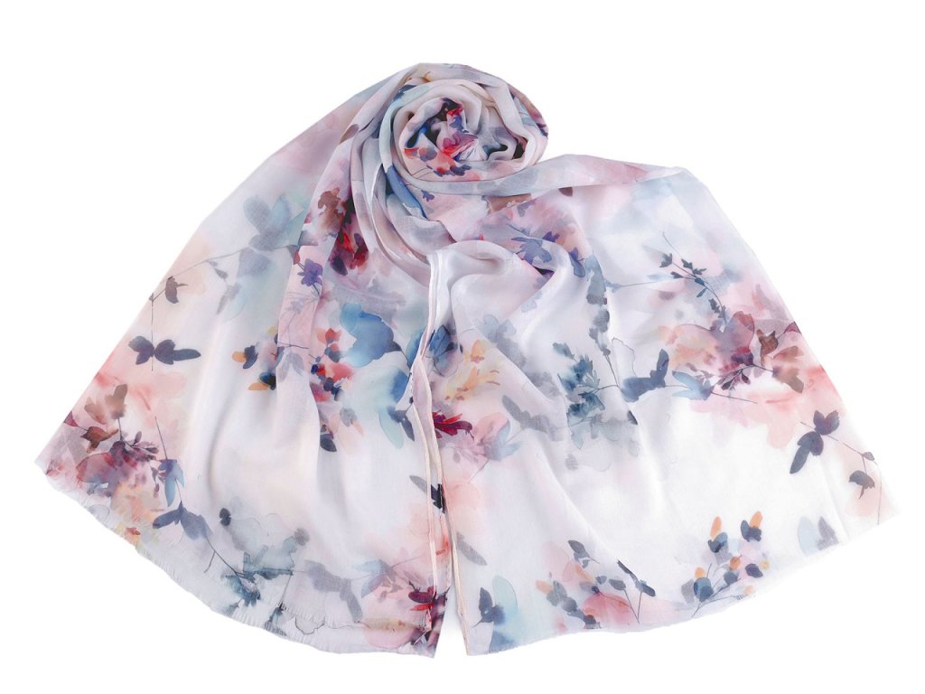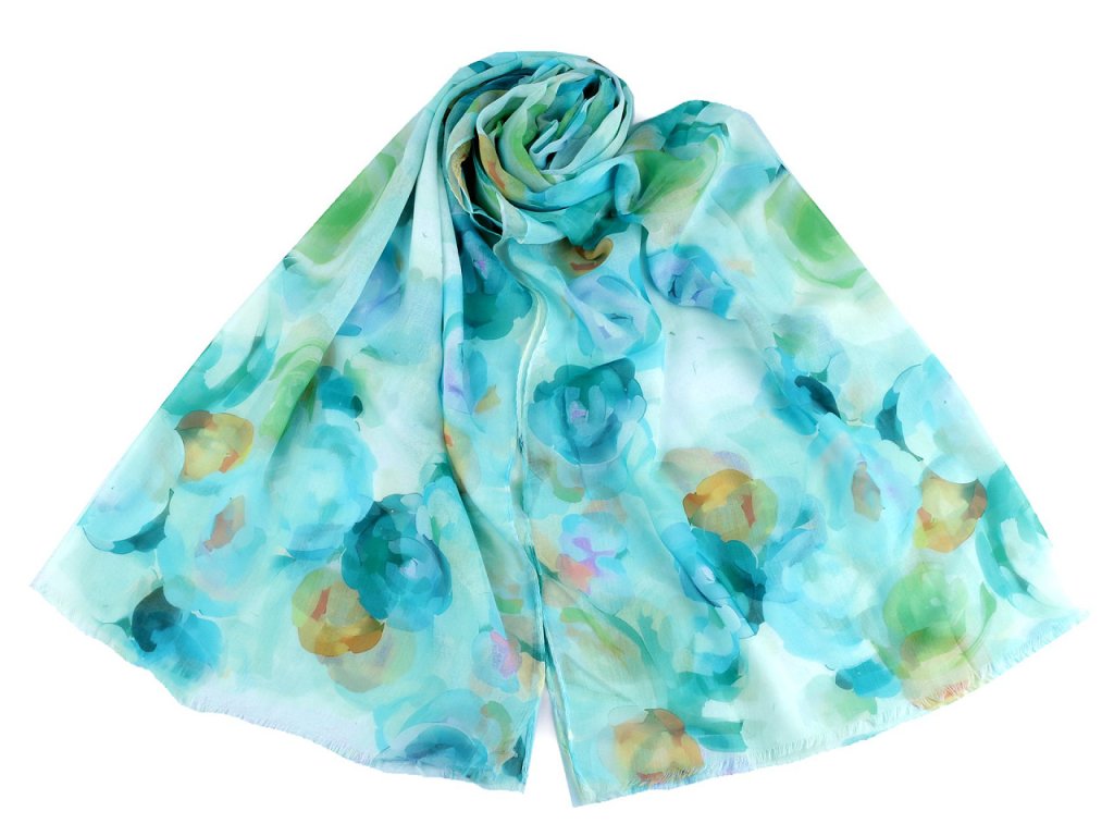 Šátek se vzorem barevných malovaných květů je lehounký a vzdušný, velice příjemný na dotek. Je jemně průsvitný, na koncích má jemné třásně. Doladí váš outfit, ať už si vezmete sako, halenku, svetřík či šaty.