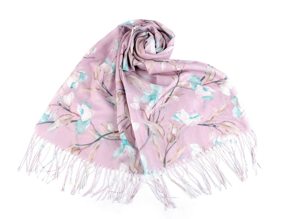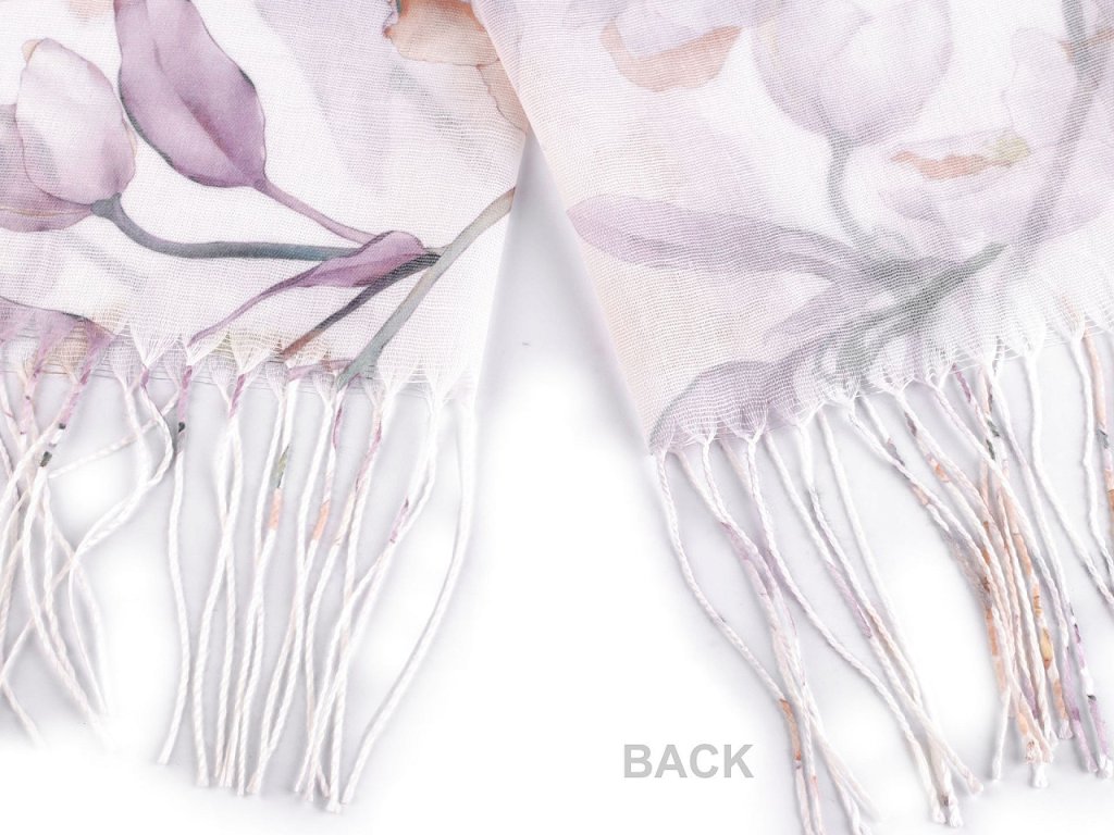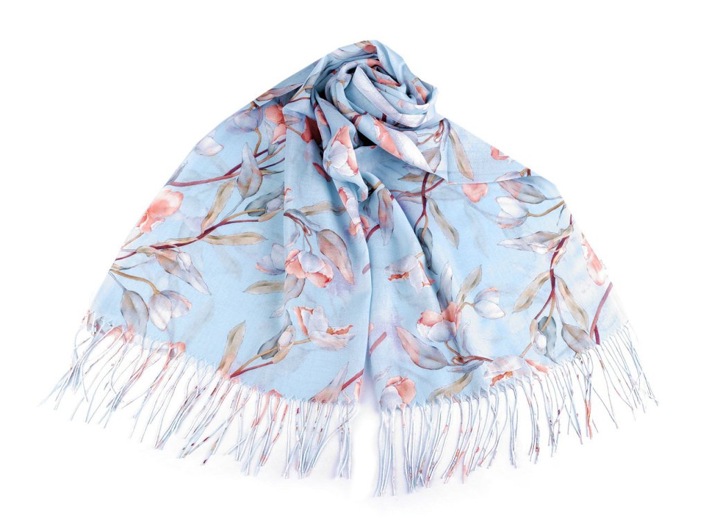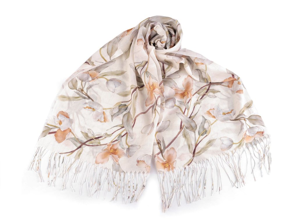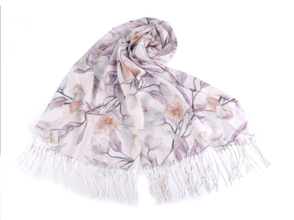 Šátek s motivem rozkvetlých květů je vzdušný a lehký, velice příjemný na dotek. Bude elegantním doplňkem pro každou příležitost. Je jemně průsvitný, na koncích má třásně. Doladí váš outfit, ať už si vezmete sako, halenku, svetřík či šaty.