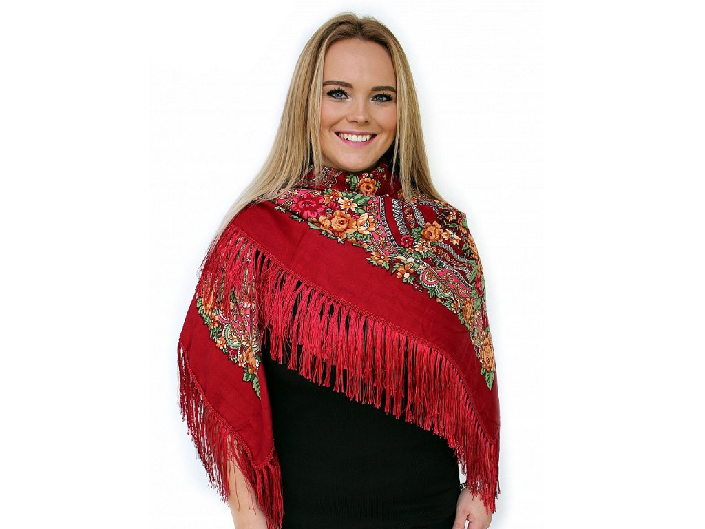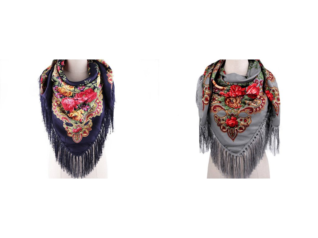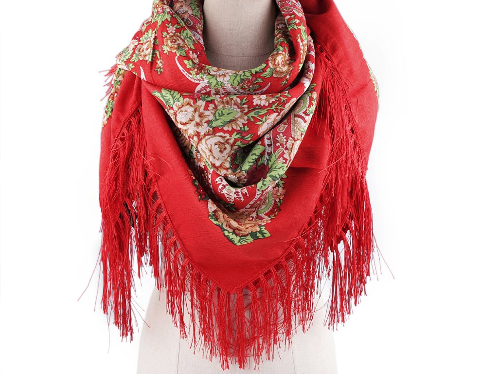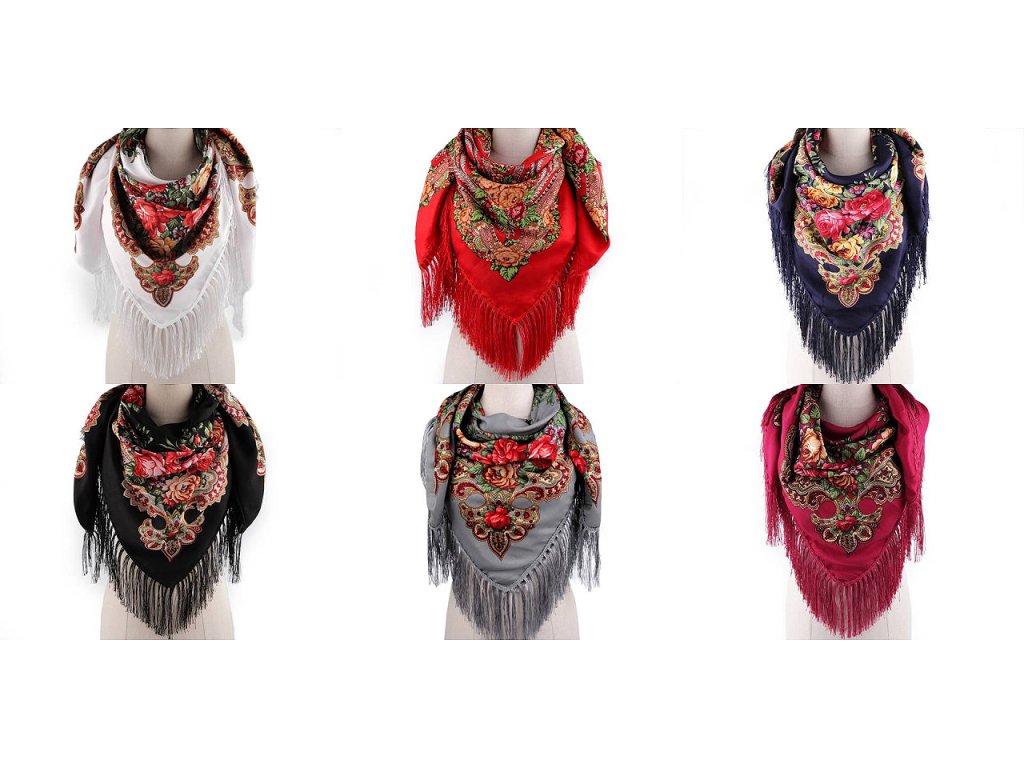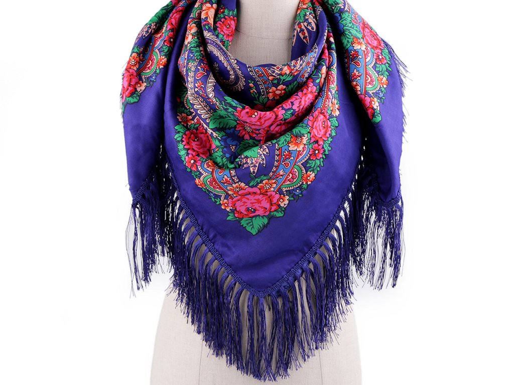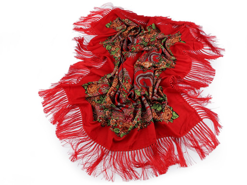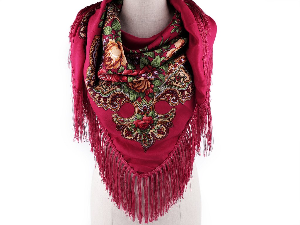 Velký folklórní šátek je doslova jako z dob našich babiček. Býval součástí tradičního oblečení a krojů. Je vyrobený z příjemného materiálu, na všech stranách je ozdobený dlouhými střapci, které krásně splývají. Velký čtvercový tvar, můžete variabilně upravit, využijete jej jak při nošení pod krkem, tak i na zádech.