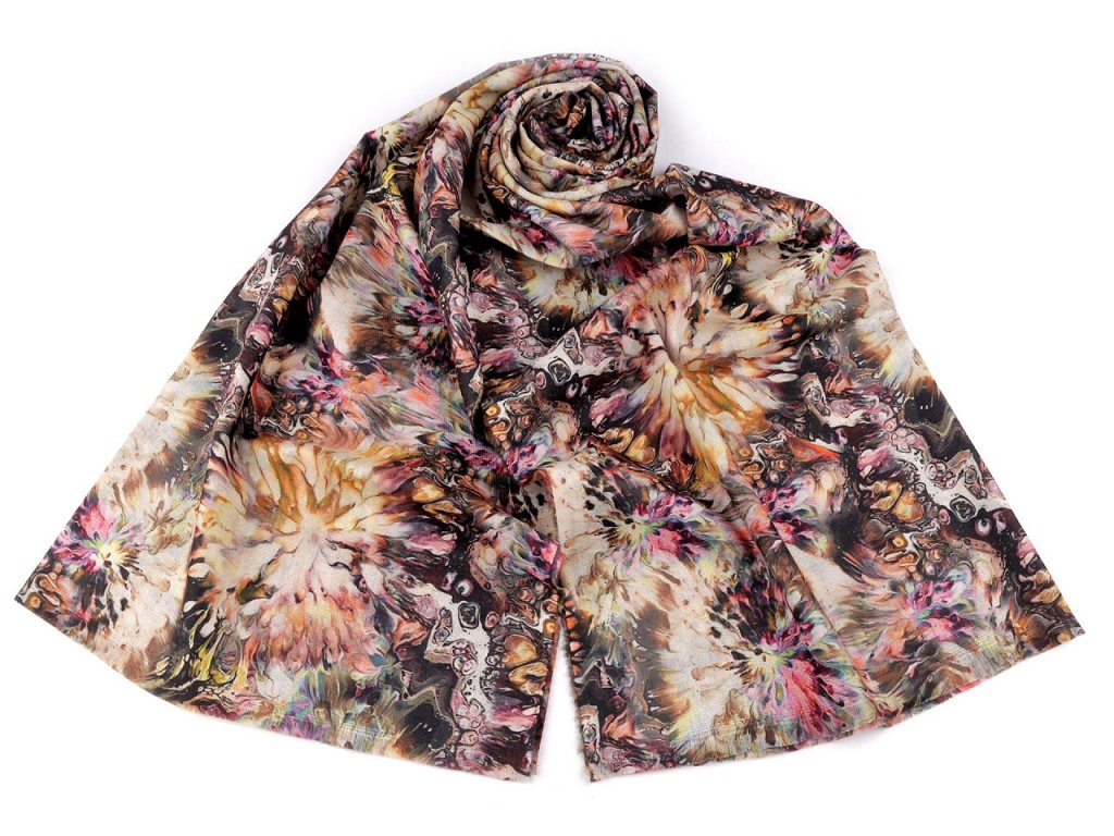 Šála s abstraktními motivy je měkká, hustě tkaná, vyrobená z materiálu příjemného na dotek. Na koncích je zakončená krátkými třásněmi. Využijete ji do společnosti i na všední nošení ke kabátu, saku, halence, svetříku, šatům apod. Příjemně zahřeje, je vhodná do chladnějšího jarního a podzimního počasí.