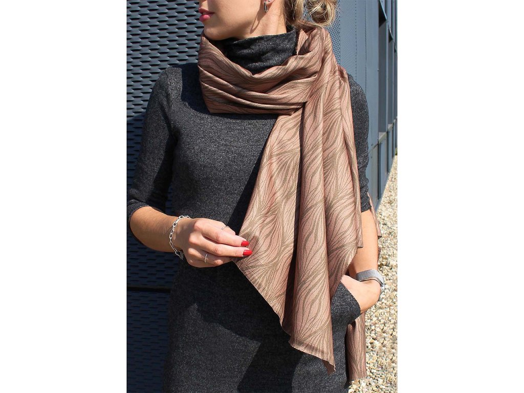 Šála s grafickým abstraktním motivem je měkká, hustě tkaná, vyrobená z materiálu příjemného na dotek. Na koncích je zakončená krátkými třásněmi. Využijete ji do společnosti i na všední nošení ke kabátu, saku, halence, svetříku, šatům apod. Příjemně zahřeje, je vhodná do chladnějšího jarního a podzimního počasí.