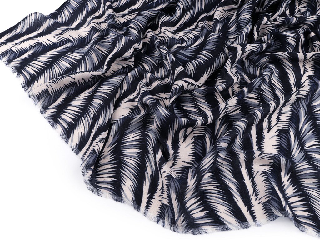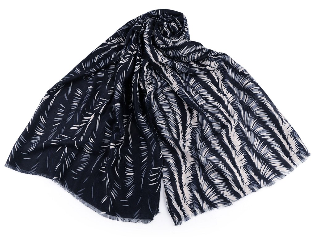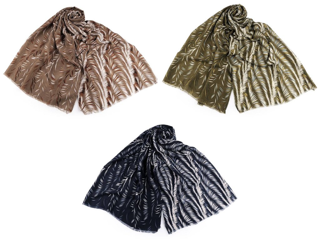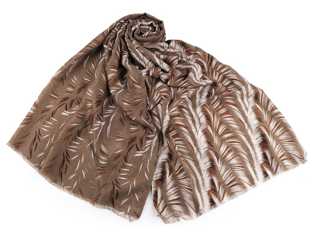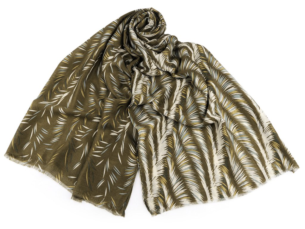 Velký šátek se vzorem rozčepýřených listů je příjemný a prodyšný, bude pohodlný v jakékoli situaci. Tento typ dezénu se skvěle kombinuje s jakýmkoliv outfitem. Ať už se chystáte do práce nebo na neformální setkání s přáteli, tento šátek je praktickým a stylovým doplňkem, který dodá vašemu vzhledu šmrnc. Na koncích je zakončený třásněmi dlouhými 1 cm.