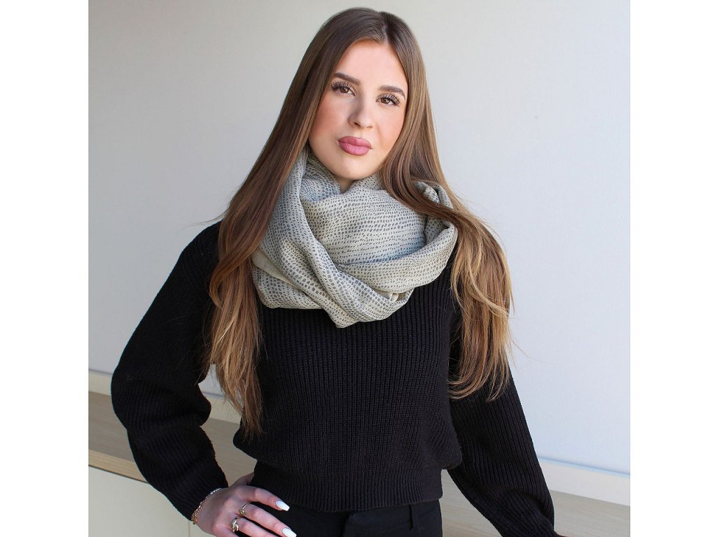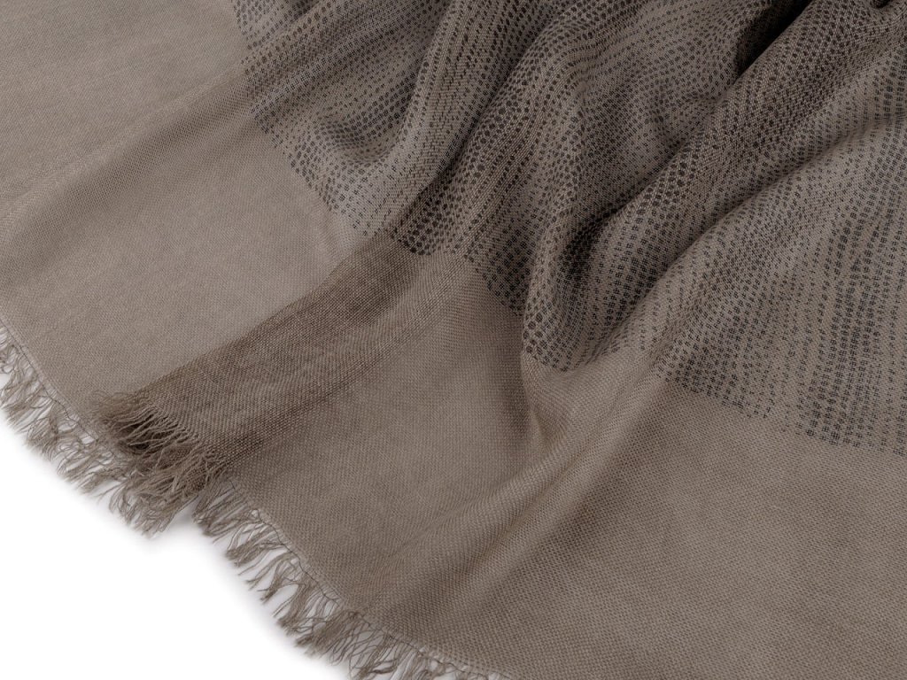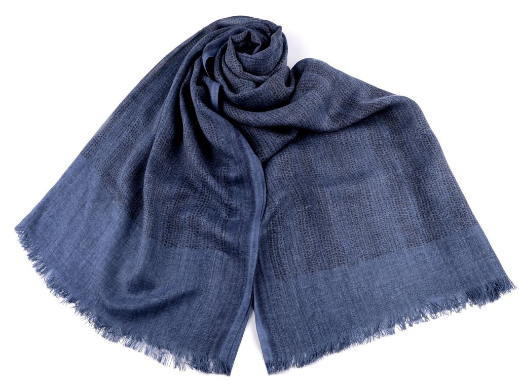 Velký šátek se vzorem nepravidelných teček je příjemný a prodyšný, bude pohodlný v jakékoli situaci. Tento typ dezénu se skvěle kombinuje s jakýmkoliv outfitem. Ať už se chystáte do práce nebo na neformální setkání s přáteli, tento šátek je praktickým a stylovým doplňkem, který dodá vašemu vzhledu šmrnc. Na koncích je zakončený třásněmi dlouhými 2 cm.