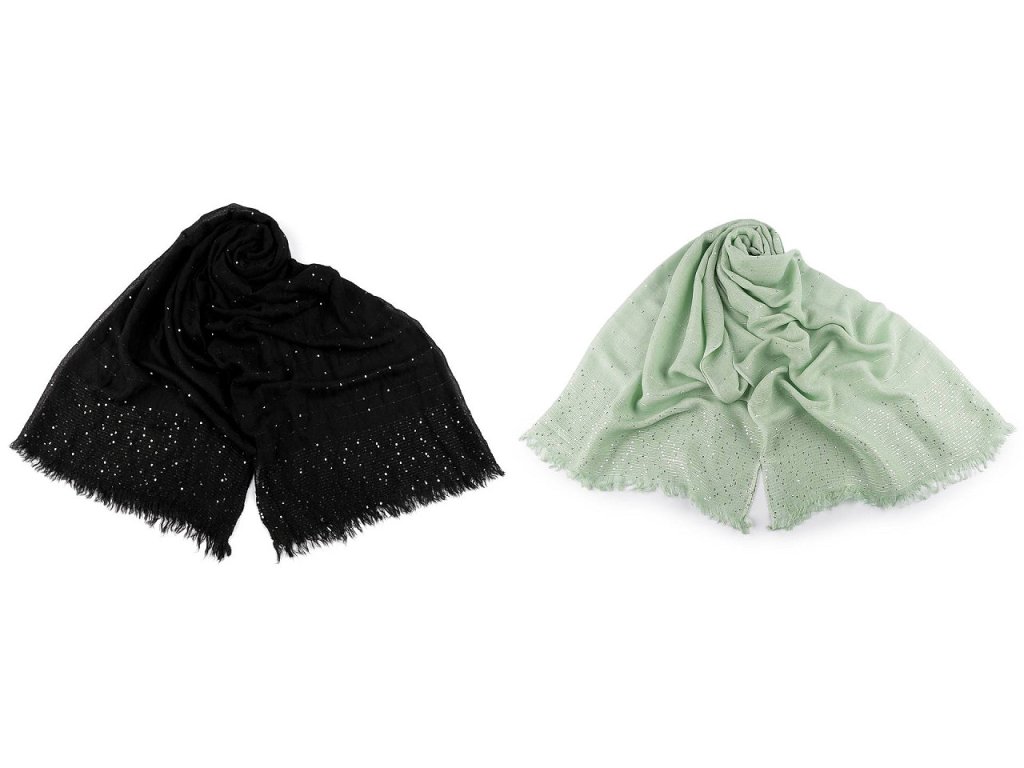 Elegantní bavlněný šátek s drobnými flitry je dokonalým doplňkem pro každou příležitost. Je oboustranný, flitry krásně zachycují světlo, vašemu outfitu dodají nádech luxusu. Materiál šátku je jemný a příjemný na dotek. Konce šátku jsou ozdobené jemnými třásněmi dlouhými 2 cm.