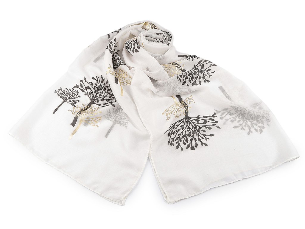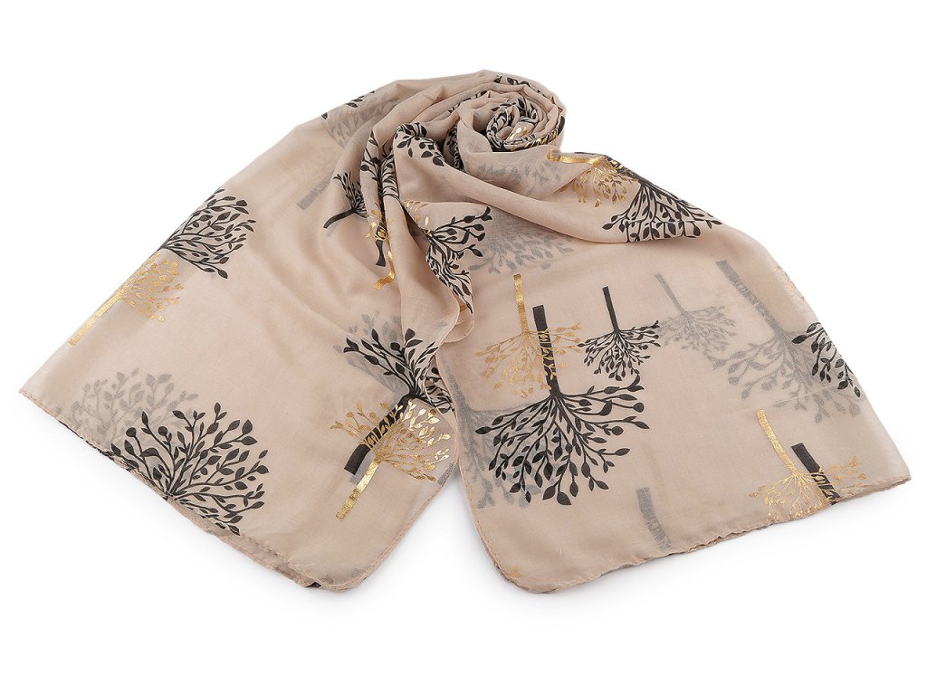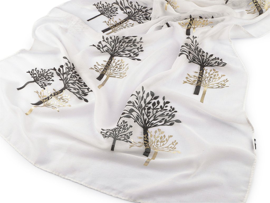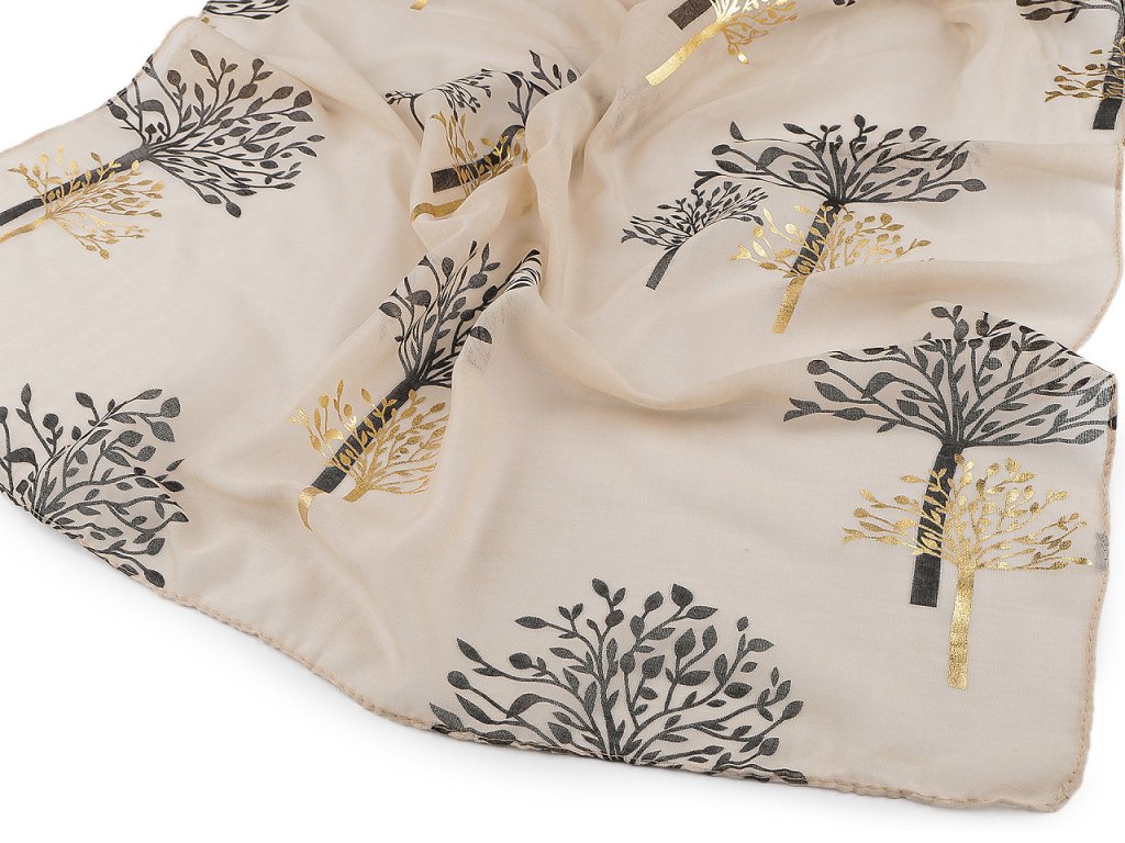 Šátek s potiskem větviček je velice příjemný na dotek, je vzdušný a lehký. Některé větvičky jsou zvýrazněné zlatou metalickou barvou. Šátek bude elegantním doplňkem pro každou příležitost, doladí váš outfit, ať už si vezmete sako, halenku, svetřík či šaty. Hodí se k formálním i neformálním outfitům, můžete ho snadno kombinovat s vaším šatníkem.