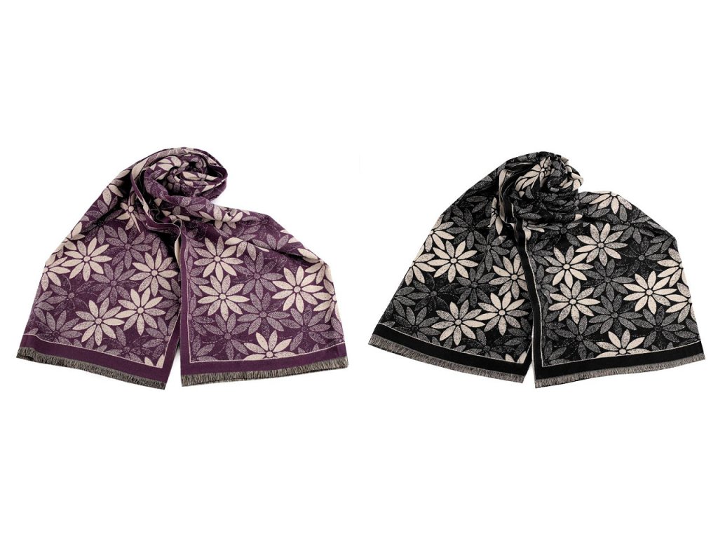 Velký luxusní šátek typu kašmír je ozdobený motivem výrazných jednoduchých květů. Je vyrobený z hřejivého materiálu, který je příjemně hebký na dotek. Krásně vás zahřeje v chladném a sychravém počasí. Hodí se ke kabátu, bundě i svetru. Na koncích je zakončený třásněmi.
