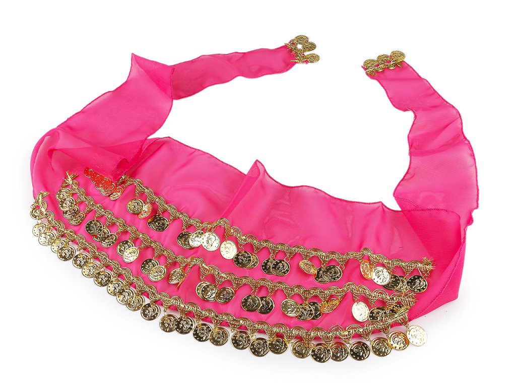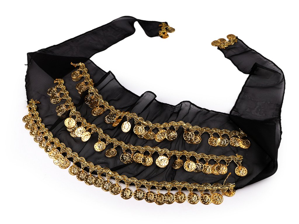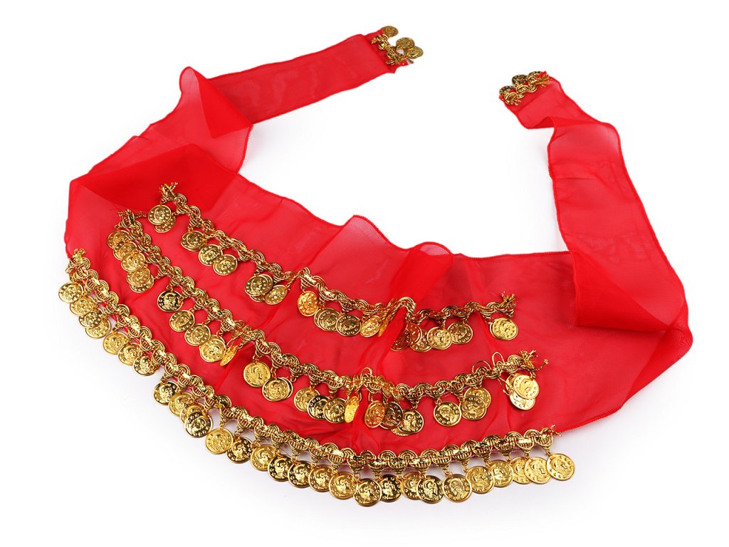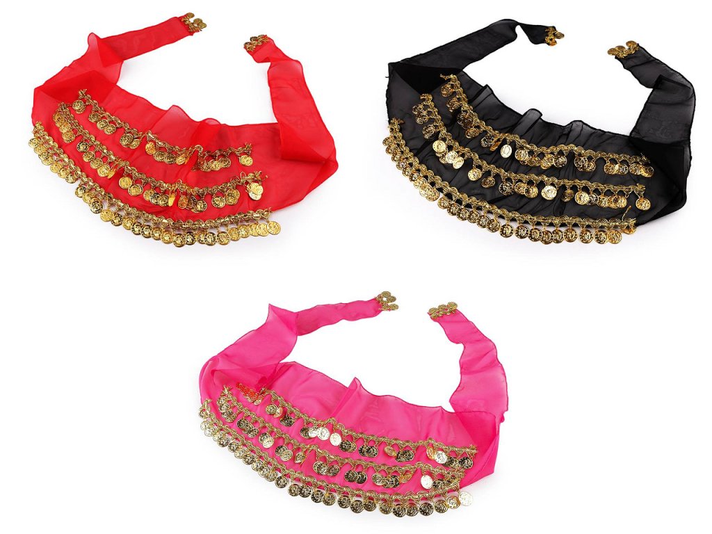 Šátek s penízky zná každá břišní tanečnice. Zavazuje se okolo boků, přizpůsobí se každé postavě. Při tanci vytváří úžasné efekty, jemně se leskne a cinká. Hodí se na sukně i kalhoty. Je ozdobený třemi řadami leonských prýmků se zavěšenými kovovými penízky. Prýmky jsou našité na monofilovém šátku, zdobí i jeho konce. Šátek bude atraktivní ozdobou každého kostýmu.