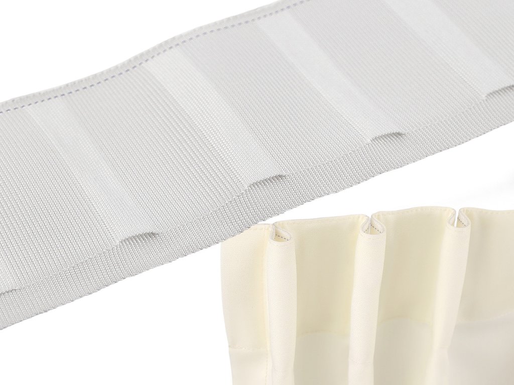 Řasící stuhu využijete na závěsy a celkově těžší materiály. Je pevná s pravidelnými poutky na háčky. Vytváří pravidelné a esteticky příjemné řasení.