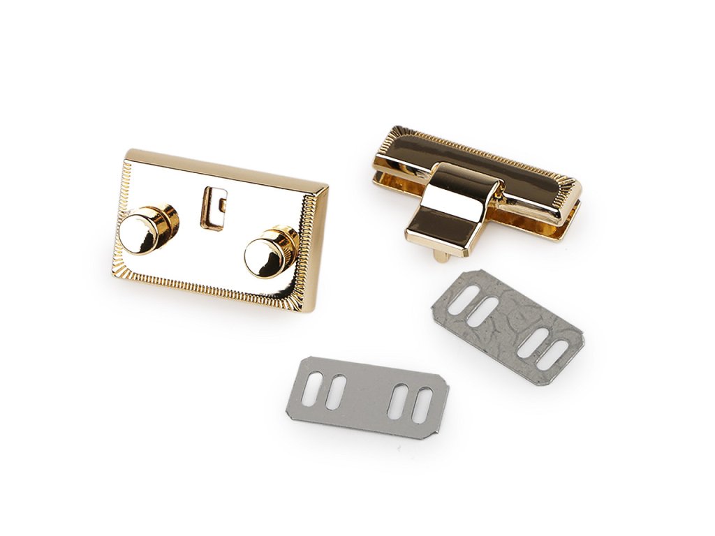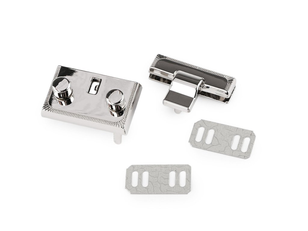 Zdobené kovové zapínání vynikne na taškách, kabelkách a elegantních batozích s klopou. Otevírá se posunutím knoflíku. Horní díl se připevňuje pomocí přiložených šroubků. Spodní díl se upevňuje nožičkami, které se z rubové strany zajistí plíšky.