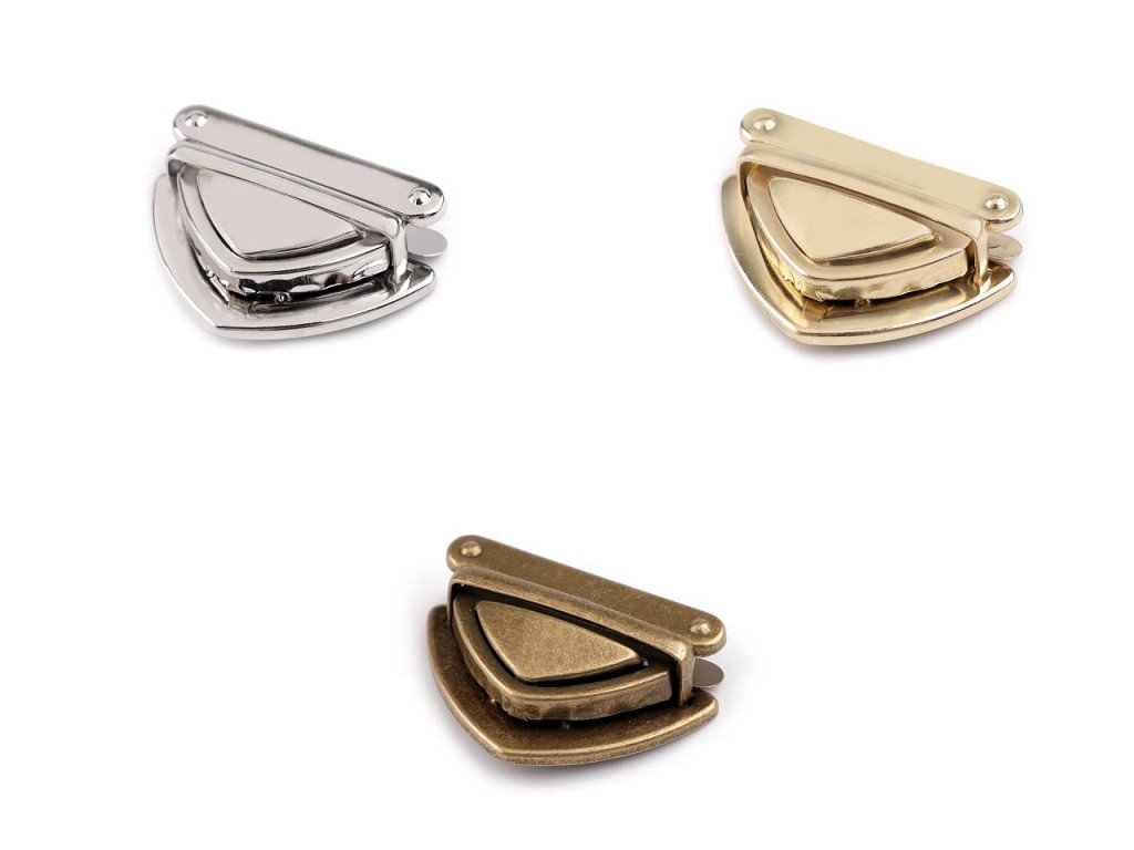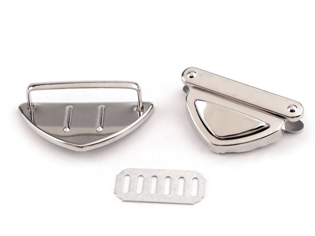 Kovové zapínání s klasickým designem využijete na tašku či kabelku. Skládá se ze tří dílů. Plíšek se připevní na vnitřní část tašky, díl s nožkami na vnější část (nožky se zaháknou do plíšku a roztáhnou) a třetí díl se zoubky na její chlopeň. Díl na chlopeň se upevní tak, že rozevřete čelisti, na kterých jsou zoubky a mezi ně vložíte materiál, na který chcete zapínání upevnit. Následně čelisti sevřete, zoubky tak zamezí pohybu látky.