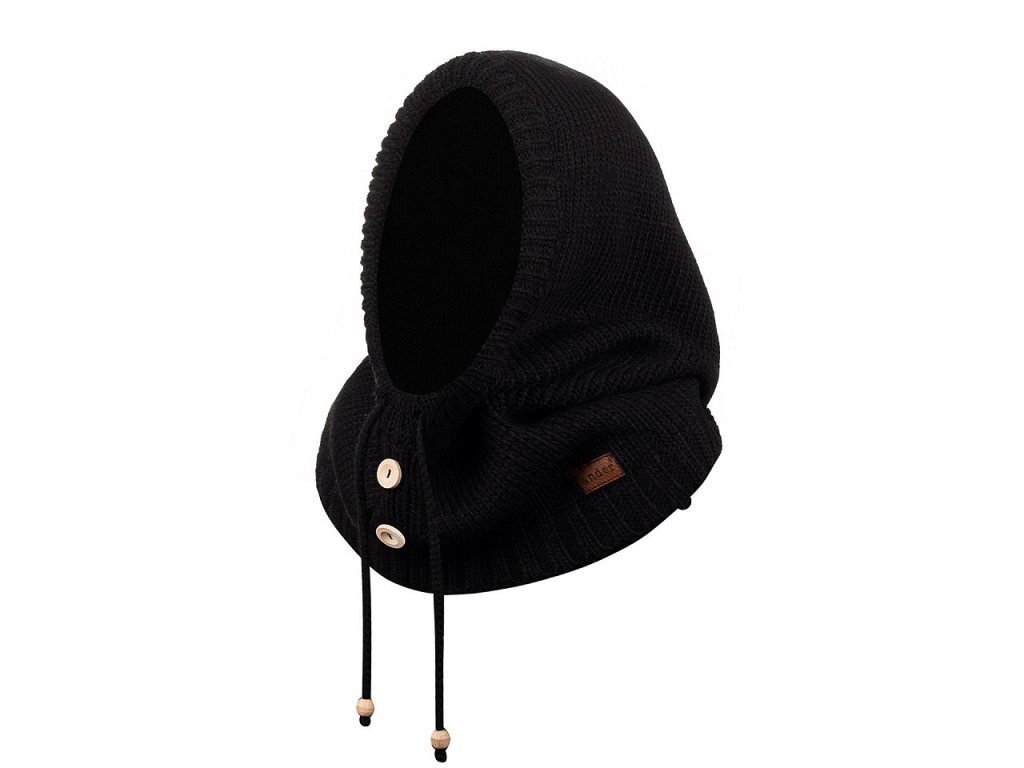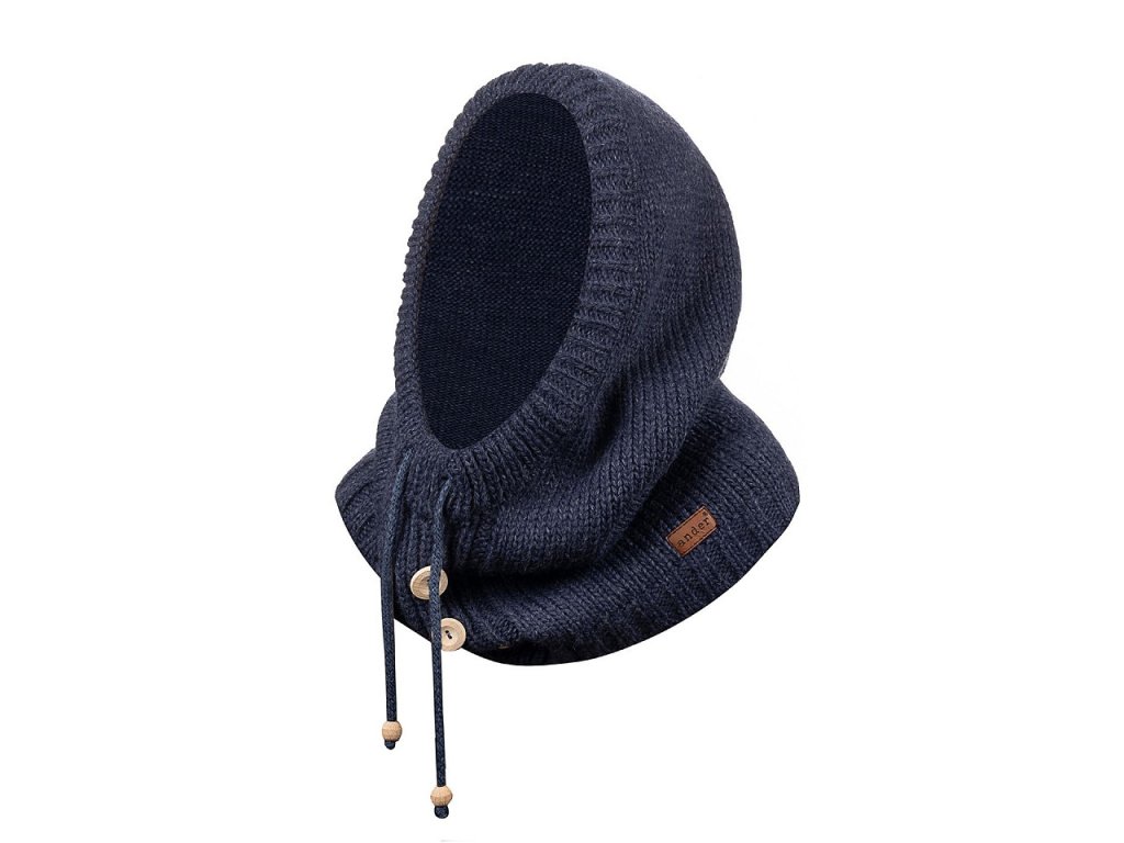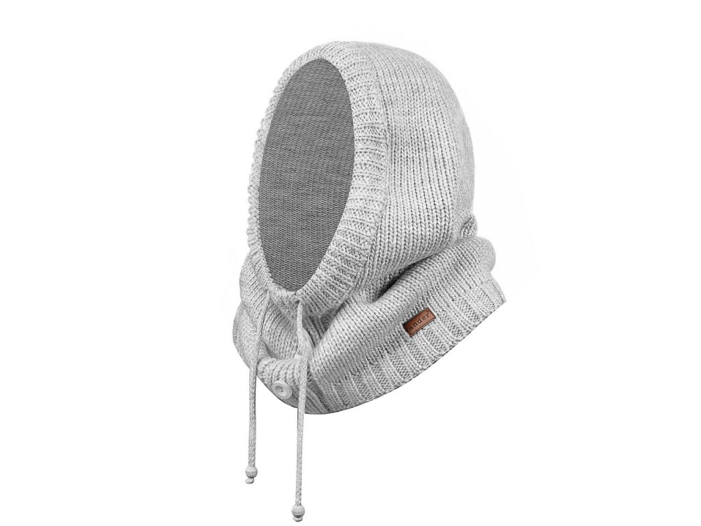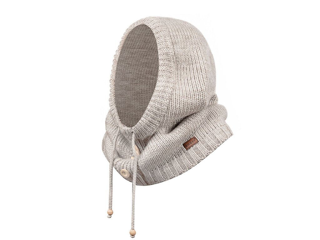 Pletený nákrčník s kapucí bude ideálním společníkem v chladném počasí. Skvěle doplní kabáty i sportovní bundy. Hodí se na běžné nošení, do společnosti i na hory. Kapuce má stahovací šňůrku s dřevěnými korálky. Můžete ji nosit na hlavě nebo svěšenou přes ramena. Uprostřed je nákrčník ozdobený dřevěnými knoflíky, na boku má kožený štítek. Pletenina je měkká a příjemná na dotek.