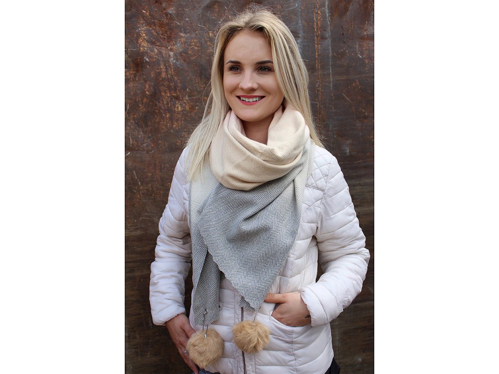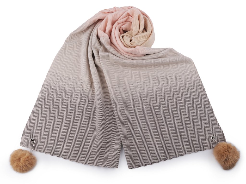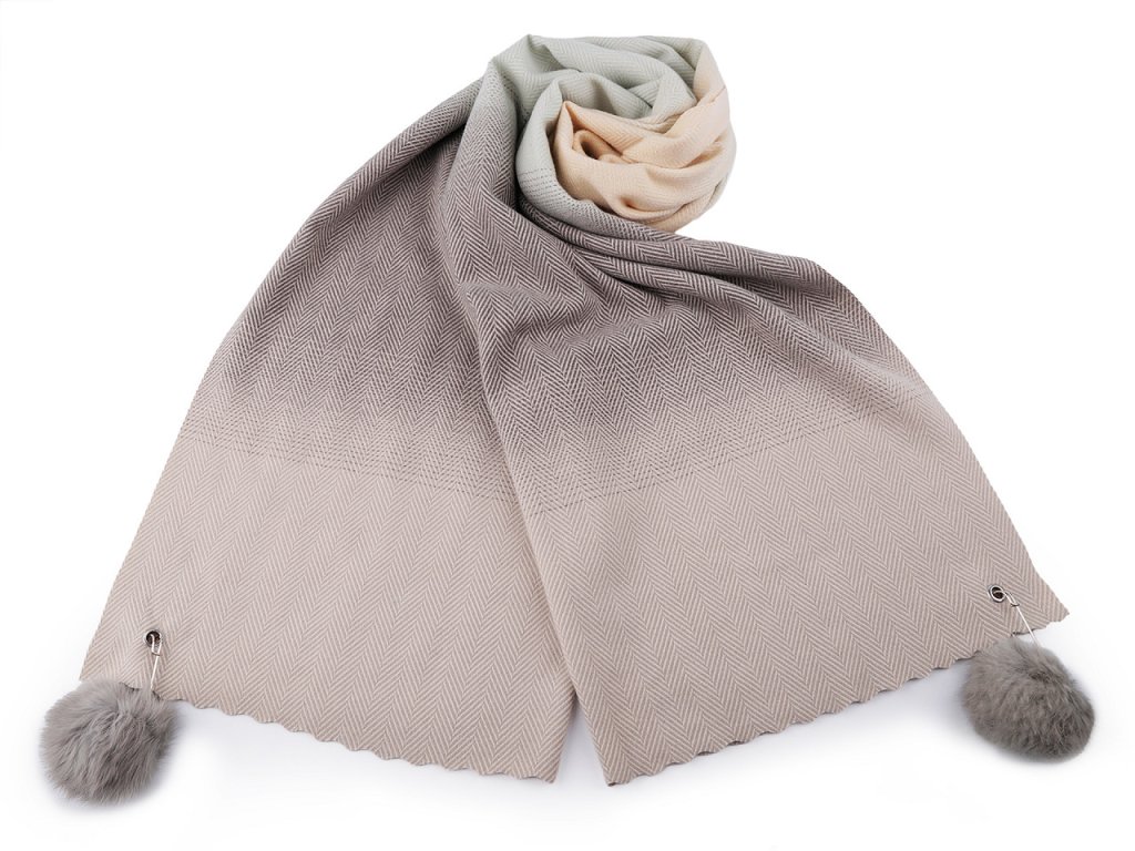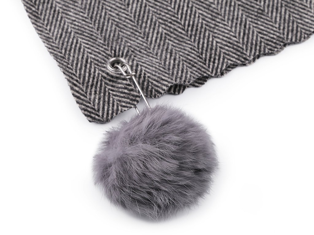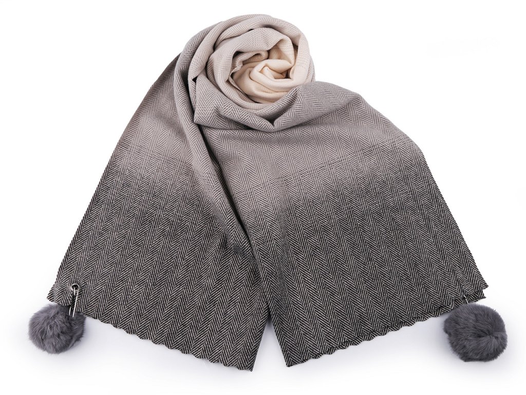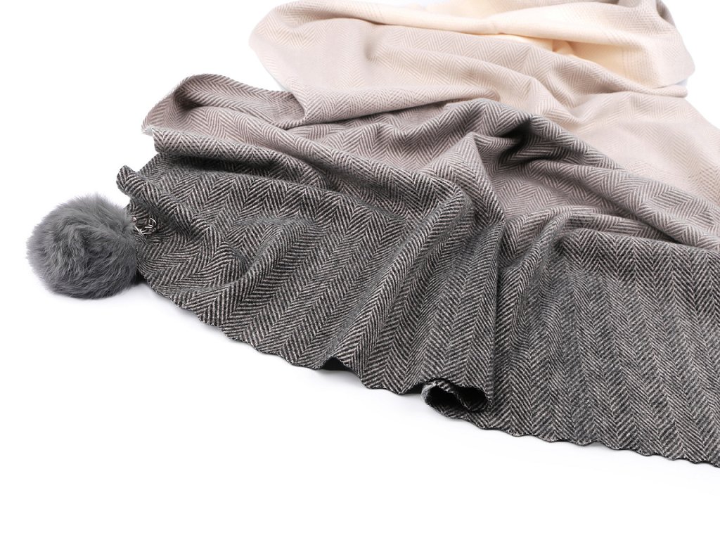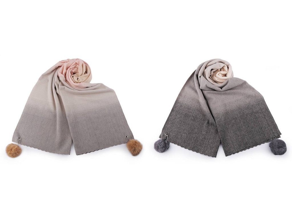 Velká šála s odnímatelnými bambulemi z umělé kožešiny vás překvapí svou výjimečnou hebkostí. Je oboustranná, vyrobená z příjemně měkkého materiálu. Vyniká i zajímavým stínování, kdy přechází barevný střed do šedých konců. Bambule jsou připevněné velkými spínacími špendlíky do otvorů s průchodkami, můžete je ze šály kdykoliv odepnout a popřípadě připnout jako ozdobu jinam. Šála vás perfektně zahřeje v sychravých dnech.