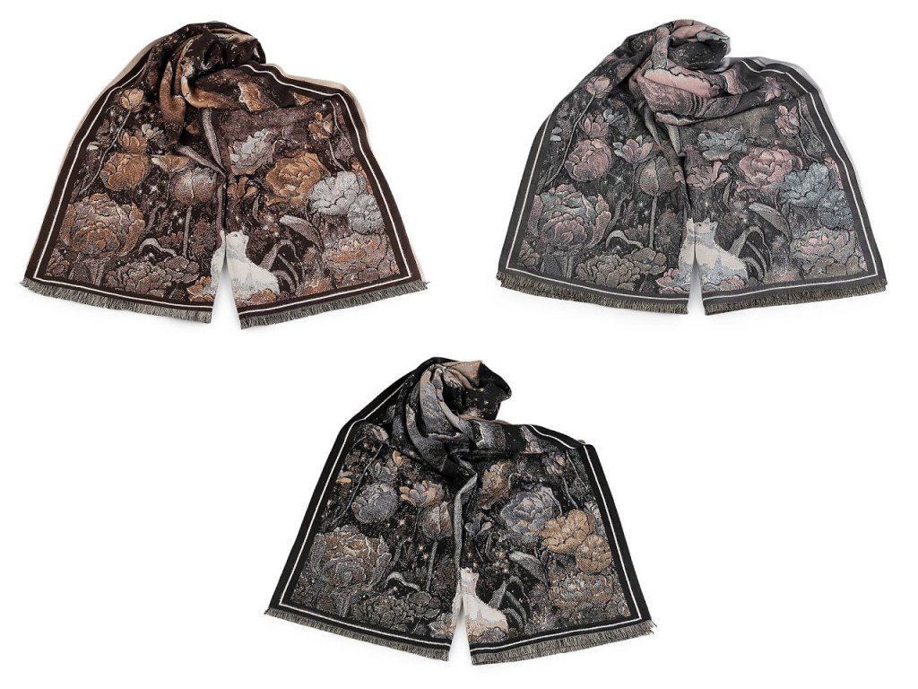 Velký luxusní šátek typu kašmír je ozdobený květinovým motivem. Je vyrobený z hřejivého materiálu, který je příjemně hebký na dotek. Pefektně vás zahřeje v chladném a sychravém počasí. Hodí se ke kabátu, bundě i svetru. Na koncích je zakončený krátkými třásněmi.