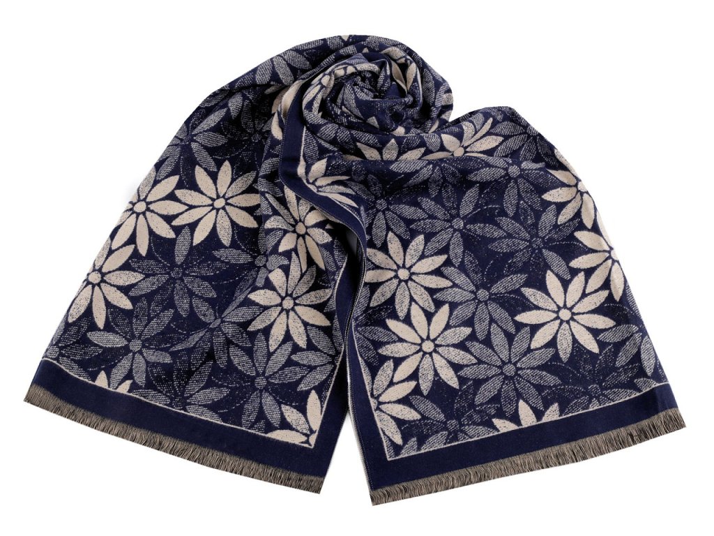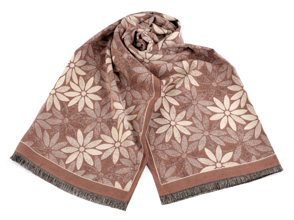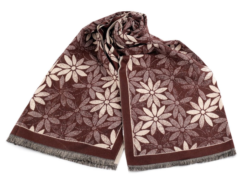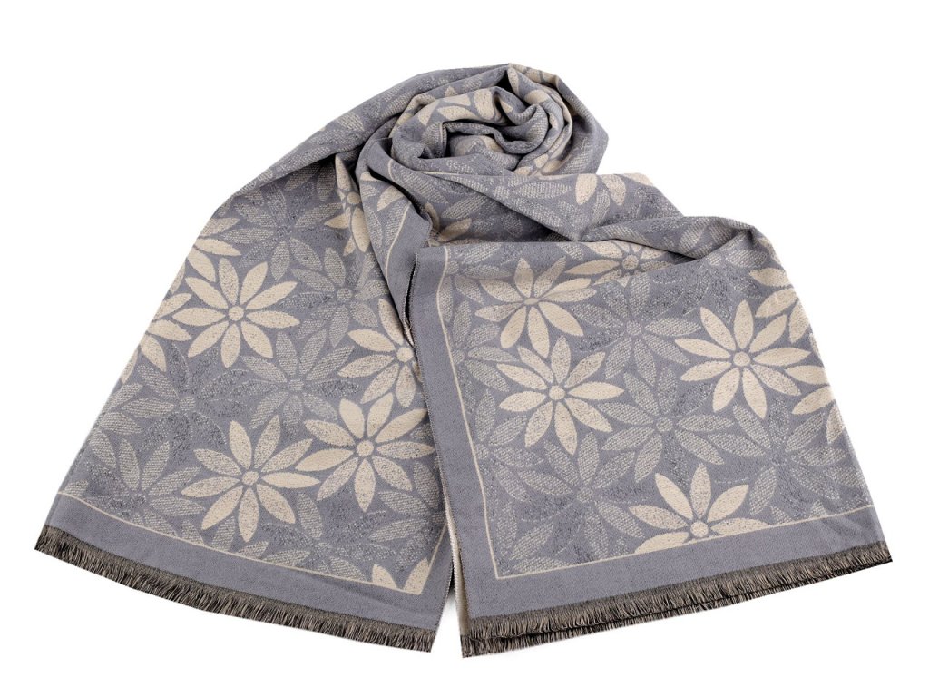 Velký luxusní šátek typu kašmír je ozdobený motivem výrazných jednoduchých květů. Je vyrobený z hřejivého materiálu, který je příjemně hebký na dotek. Krásně vás zahřeje v chladném a sychravém počasí. Hodí se ke kabátu, bundě i svetru. Na koncích je zakončený třásněmi.