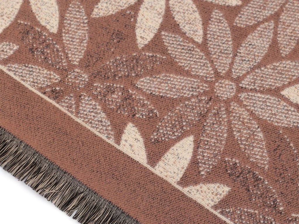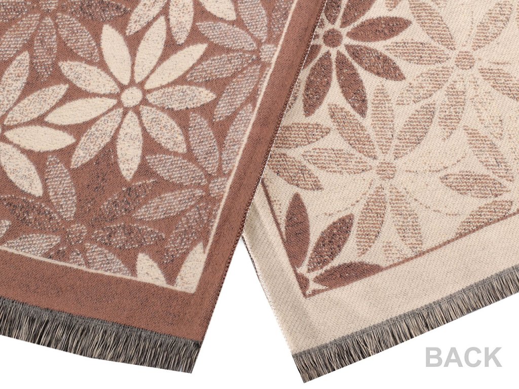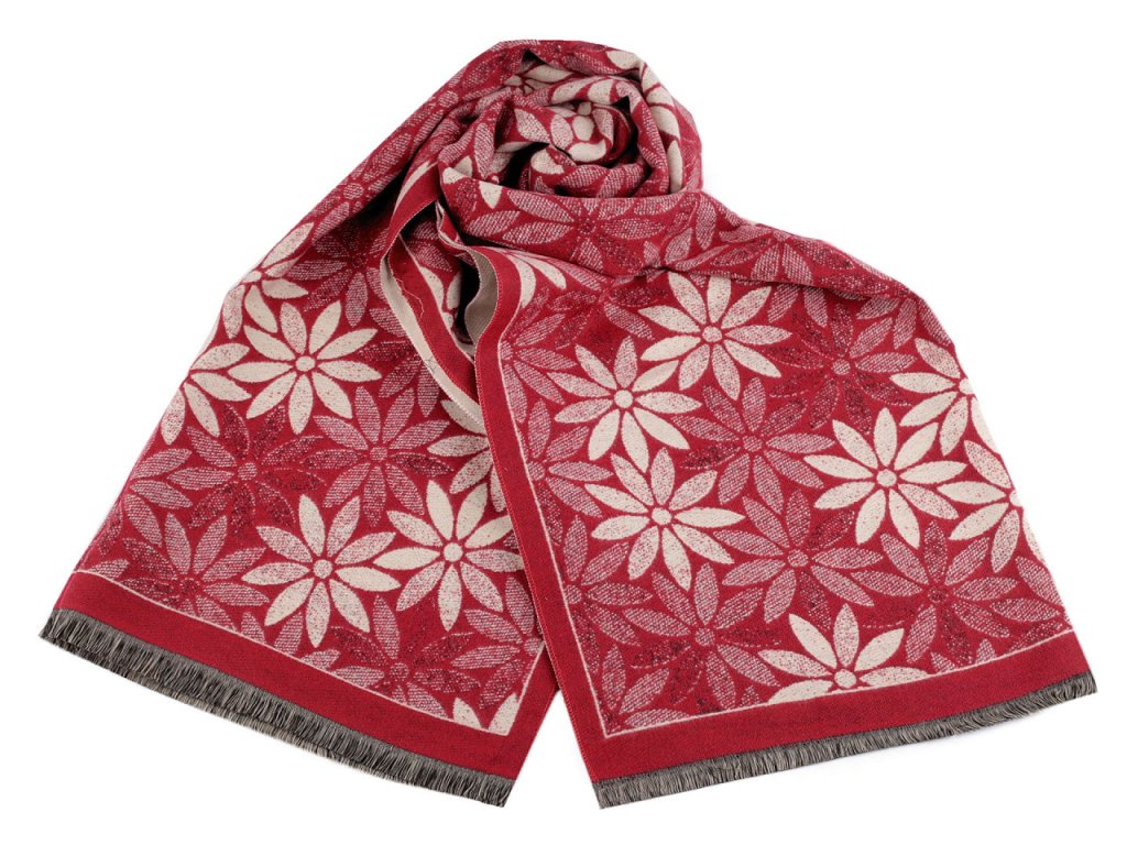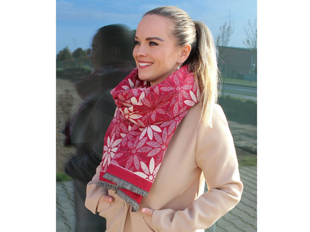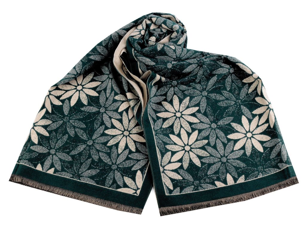 Velký luxusní šátek typu kašmír je ozdobený motivem výrazných jednoduchých květů. Je vyrobený z hřejivého materiálu, který je příjemně hebký na dotek. Krásně vás zahřeje v chladném a sychravém počasí. Hodí se ke kabátu, bundě i svetru. Na koncích je zakončený třásněmi.