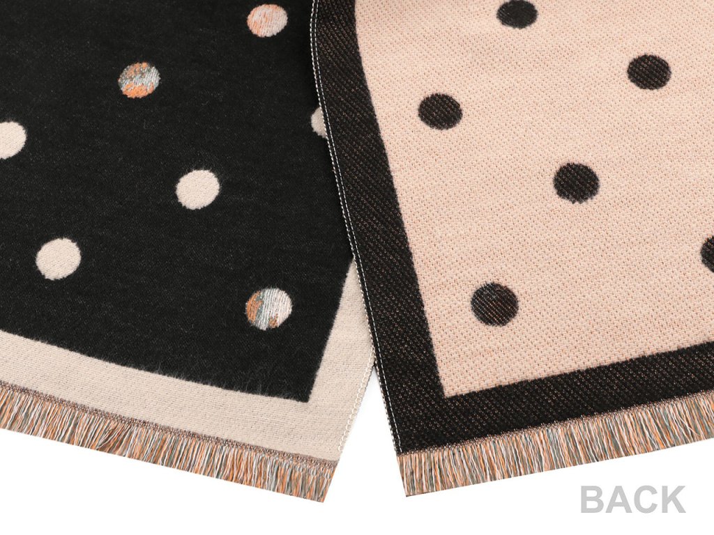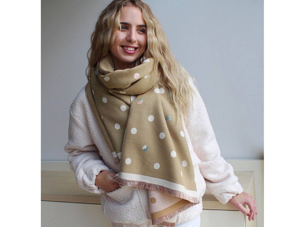 Velký luxusní šátek typu kašmír je ozdobený motivem puntíků. Je vyrobený z hřejivého materiálu, který je příjemně hebký na dotek. Krásně vás zahřeje v chladném a sychravém počasí. Hodí se ke kabátu, bundě i svetru. Na koncích je zakončený třásněmi.